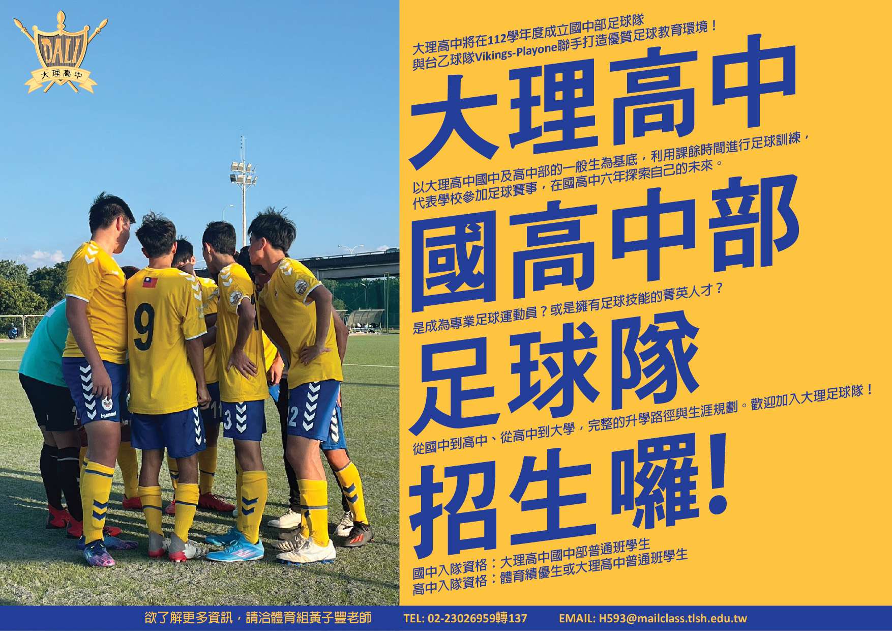 說明: 一、本校112學年度運動績優生招生簡章如附件一,足球隊招生 DM如附件二,跆拳道隊招生DM如附件三。 二、有關本校運動績優生招生諮詢,請洽本校體育組:02- 23026959#137。 三、各代表隊教練聯絡電郵:足球隊 黃子豐老師 H593@mailclass.tlsh.tp.edu.tw ;跆拳道隊 李昆懿教 練 kunyi0113@gmail.com 。