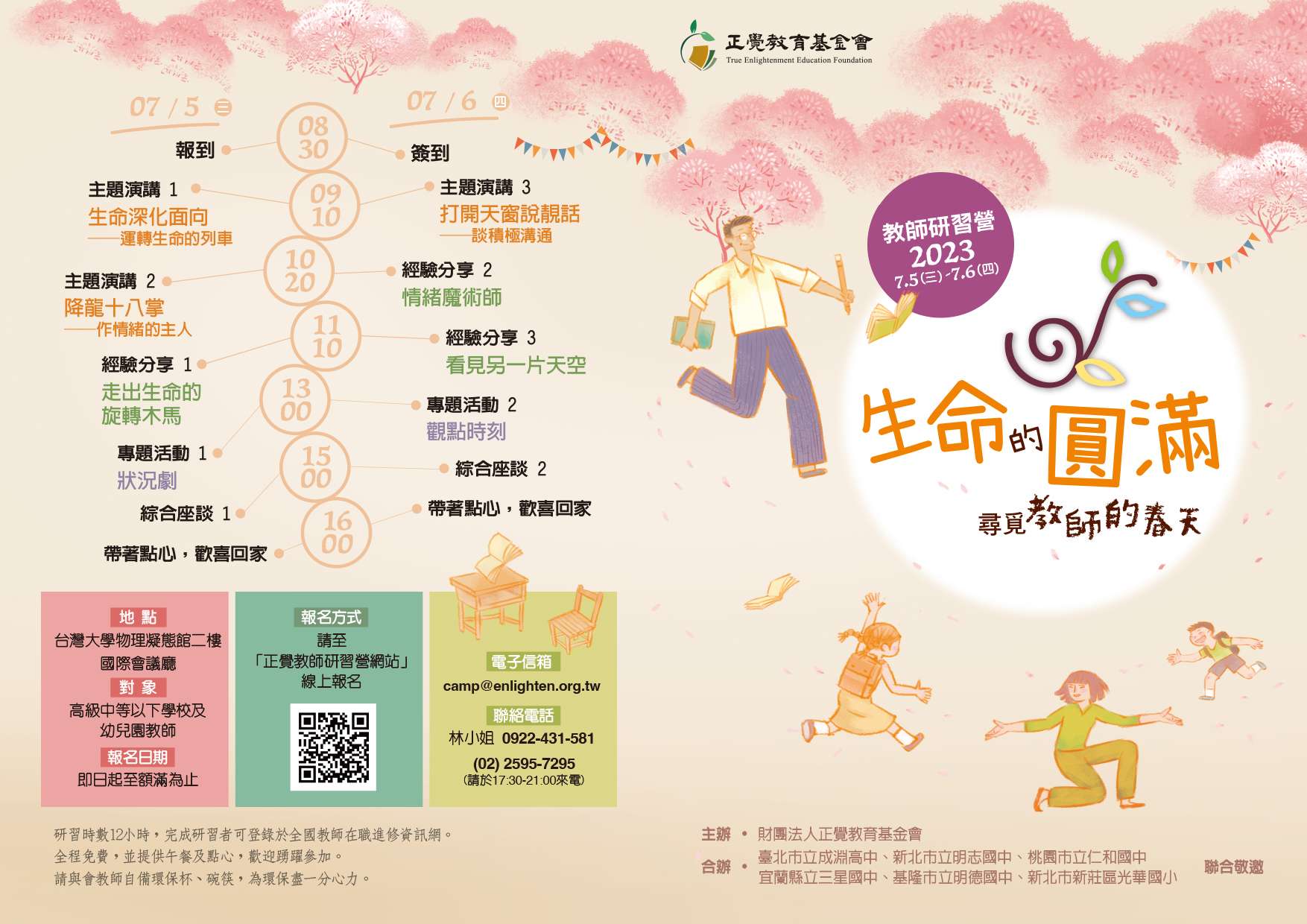 (四)報名:4月30日起至額滿為止,請上正覺教師研習營網站報名。(https://www.teachercamp.enlighten.org.tw)