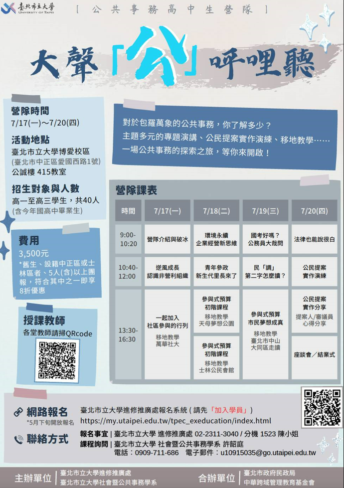 (四)活動內容:帶領學生透過專題演講、公民提案實作演 練、移地教學等方法認識公共事務。
