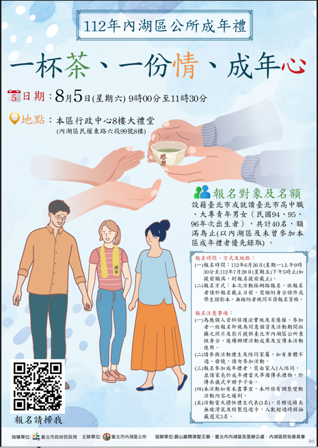 臺北市內湖區公所112年度 成年禮活動,訂於8月5日(星期六)上午9時舉辦,凡成功 報名並全程參與之禮生,可獲得成年禮紀念郵票、智慧 巾、茶具組及禮券600元各1份。活動內容包含茶道文化體 驗、穿越智慧門、行感恩禮及成年禮專屬拍貼機,即日起 開放報名,歡迎設籍或就讀於臺北市之青年男女(民國94 至96年次)踴躍報名參加,內容豐富,精彩可期。