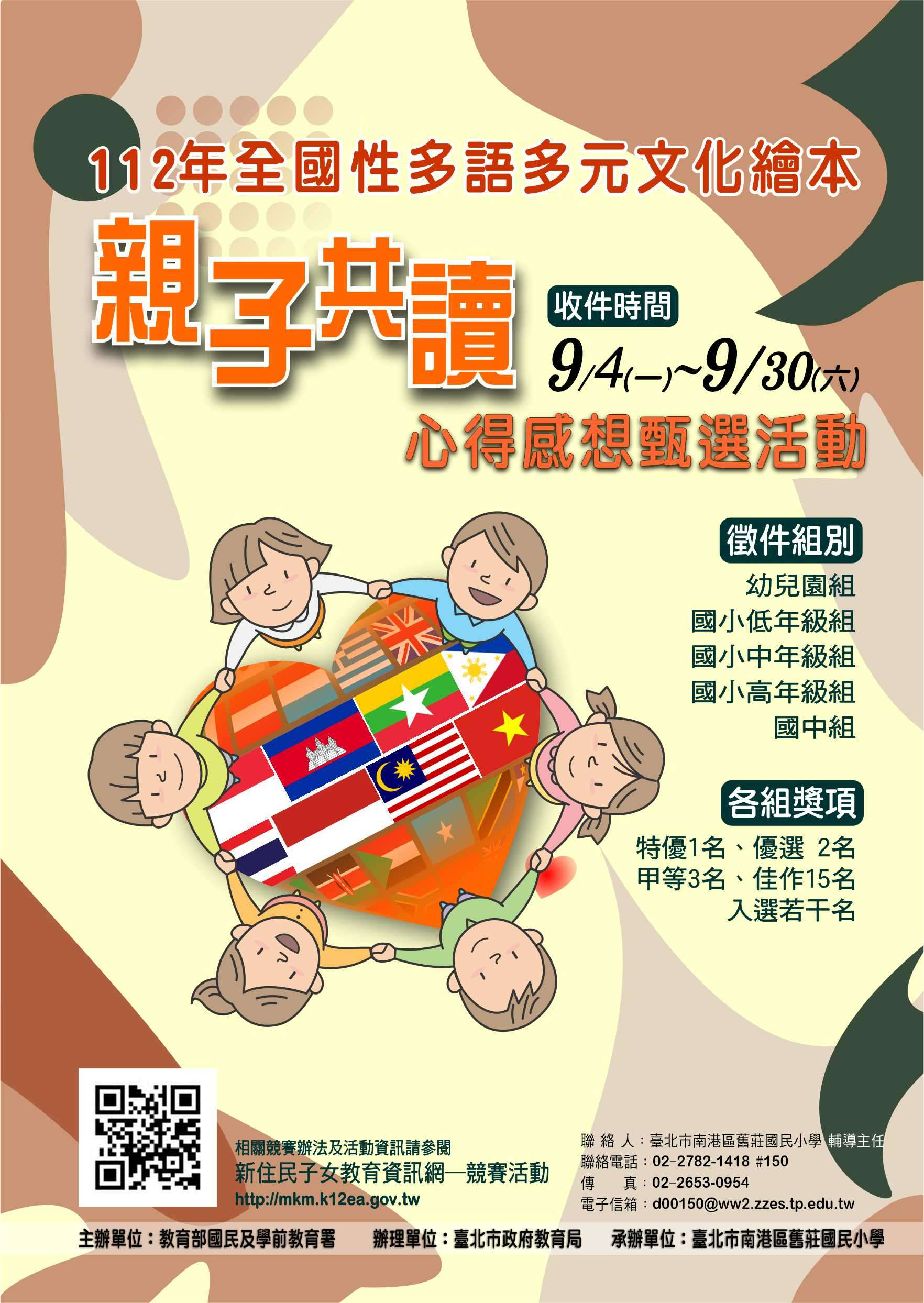 六、檢附112年度全國性多語多元文化繪本親子共讀心得感想甄選活動計畫及電子海報各1份。