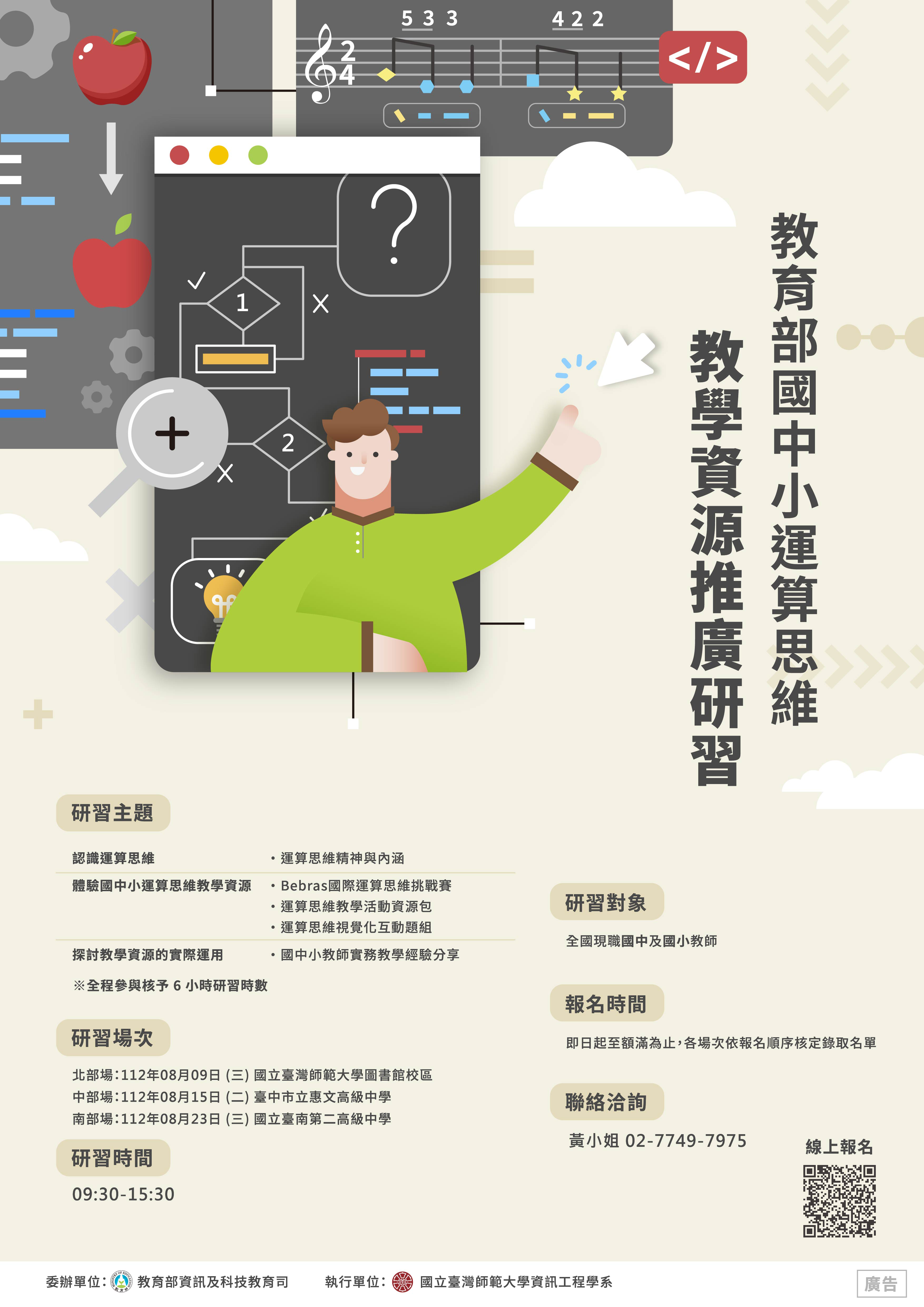 一、為推廣國中小運算思維教學資源與運用策略,協助教師活用以幫助學生建立良好的運算思維及未來進行程式學習基礎,該校特辦理旨揭研習,相關資訊摘錄如下: