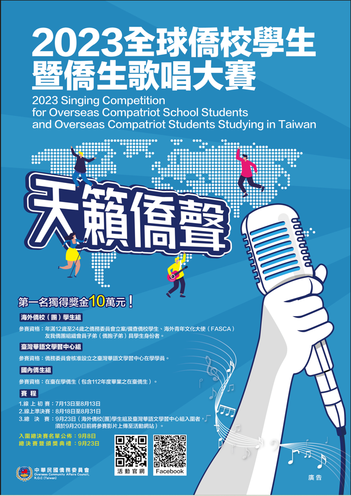 二、僑委會為鼓勵僑校學生、僑胞子弟、臺灣華語文學習中心 及國內僑生藉由傳唱華語、閩南語及客語等歌曲,強化語 文學習動機、認識及體驗臺灣不同族群語言及流行音樂文 化,爰續規劃辦理旨揭賽事。