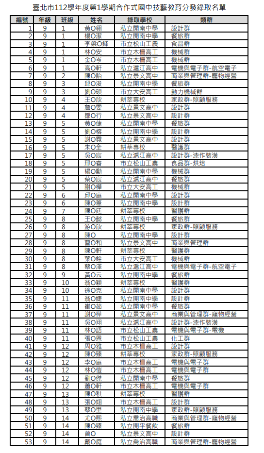 請九年級同學注意, 「112-1技藝教育課程」錄取名單如下, 預計於9/7(四)召開「校內開班說明會」 9/12(二)正式上課 開學後將發放相關紙本通知,敬請留意。