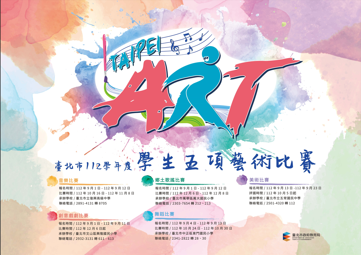 臺北市學生五項藝術(音樂、舞蹈、創意戲劇 及鄉土歌謠)比賽,9/1起陸續開放網路報名。相關訊 息及作業時程,請至臺北市五項藝術比賽網站查詢, 逾期不受理。