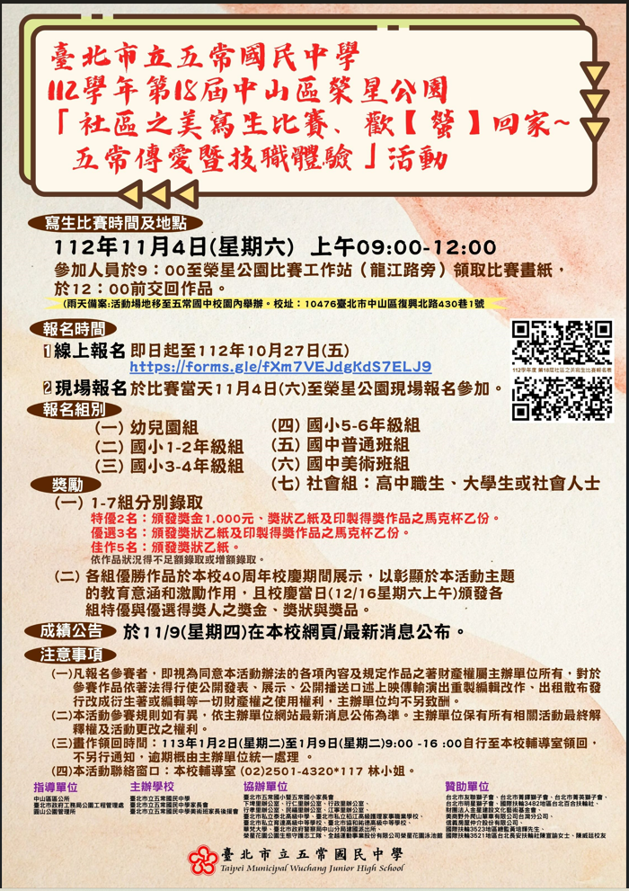 二、比賽地點:榮星公園內(臺北市中山區民權東路三段與龍 江路口),若遇雨天照常舉行,比賽地點移至五常國中(臺北市中山區復興北路430巷1號)校內。
