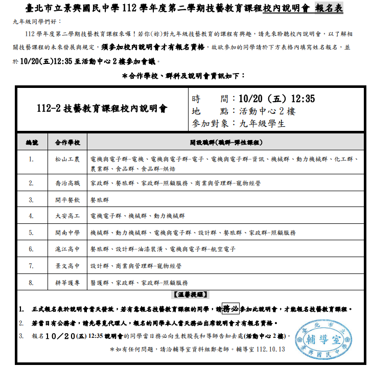各位九年級同學,若你想參加技藝教育課程,每週二下午至技術型高中實地上課的話,請一定要來參加說明會喔! 備註:如果你想了解更多技職教育,可點選「國中畢業生適性入學宣導網站」觀看相關介紹
