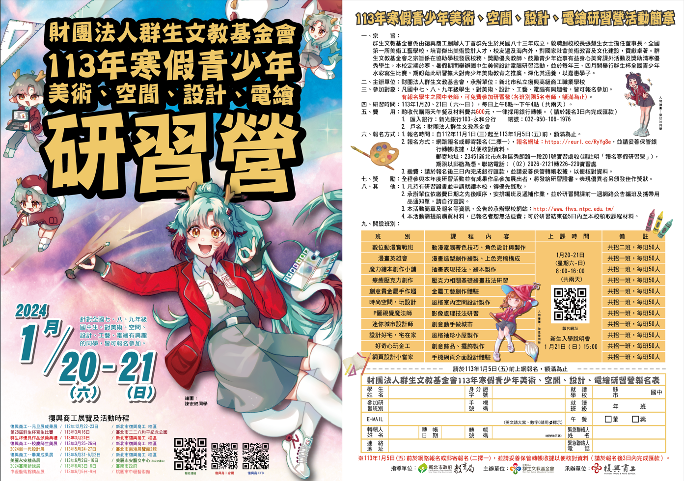三、參加對象:凡全國國中七、八、九年級,對美術、設計、 工藝、電腦有興趣者,皆可報名參加,有報名學生之國中老師,可免費參加研習營(各班別限5名老師,額滿為止)。