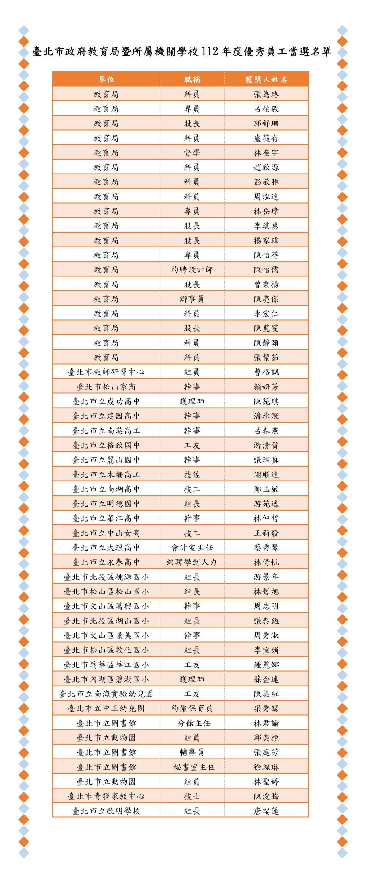 轉知教育局暨所屬機關學校112年度優秀員工當選名單1份,請參閱附件。
