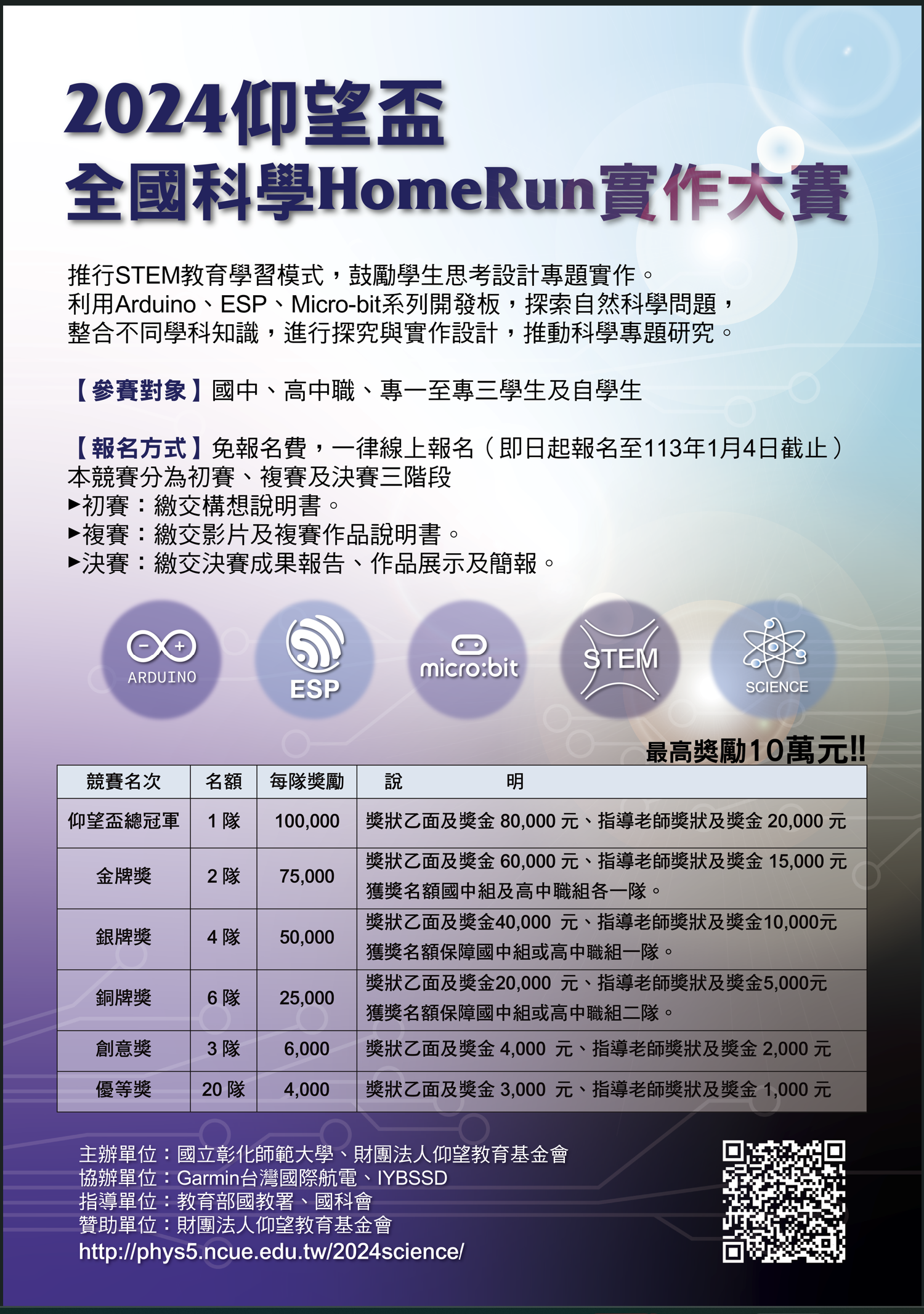 一、旨揭活動為彰師大與「財團法人仰望教育基金會」合作推行STEM教育,利用Arduino、ESP或Micro-bit系列開發板實作設計,進行科專題探究而共同辦理,活動訂於113年5月4日(星期六),假彰師大辦理,詳細活動訊息請參閱競賽手冊。