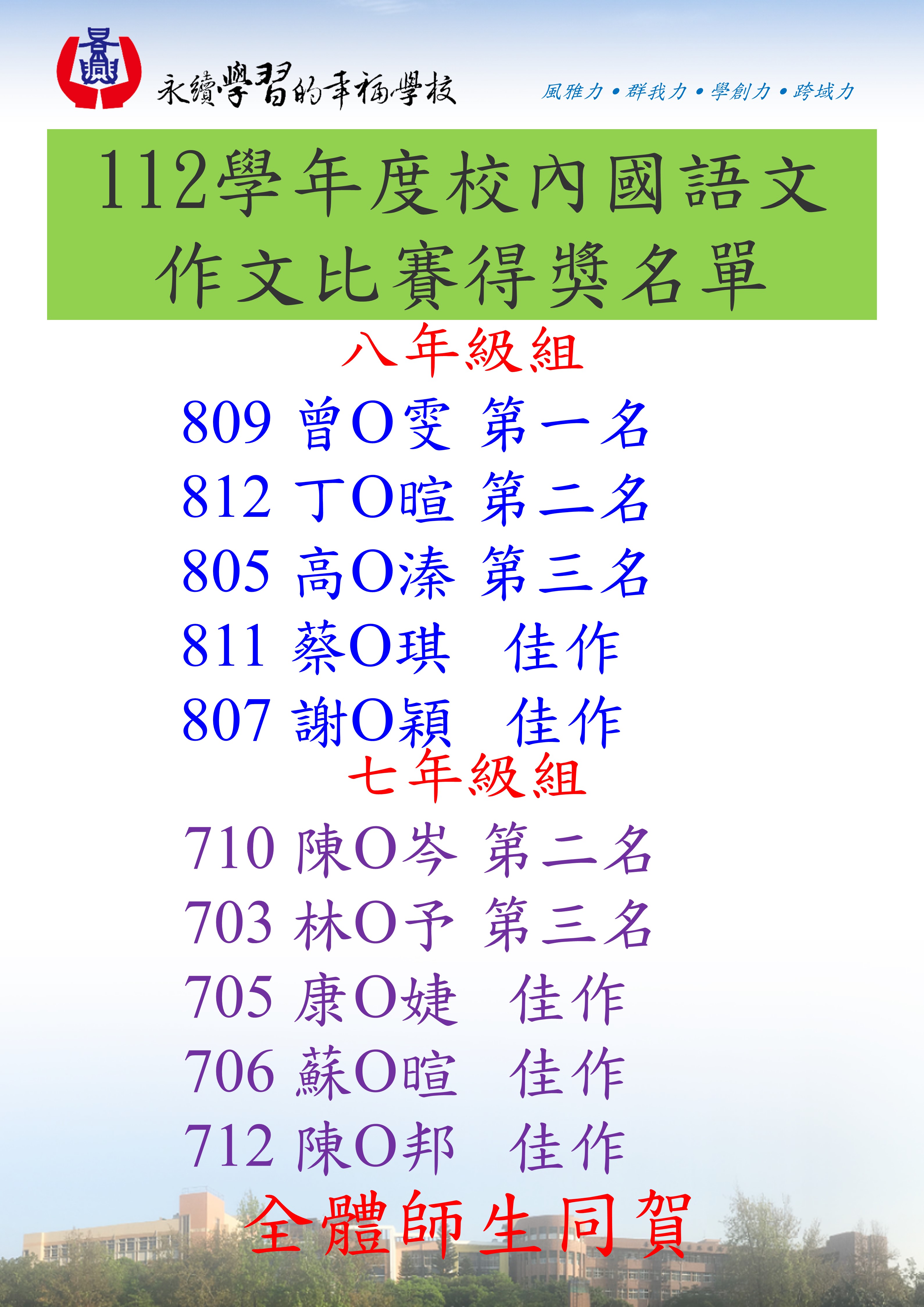 由八年級第一名代表學校參加113年度臺北市國語文競賽