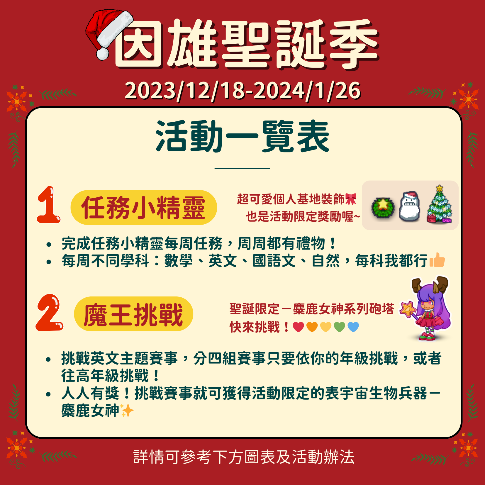 二、旨揭活動於112年12月18日(星期一)起至113年1月26日(星期五)止,每日7時至22時,歡迎全國師生踴躍參加。 詳細活動內容請參閱官網(https://adl.edu.tw/hero/) 及臉書粉絲專頁(https://www.facebook.com/heroj7. tn)。