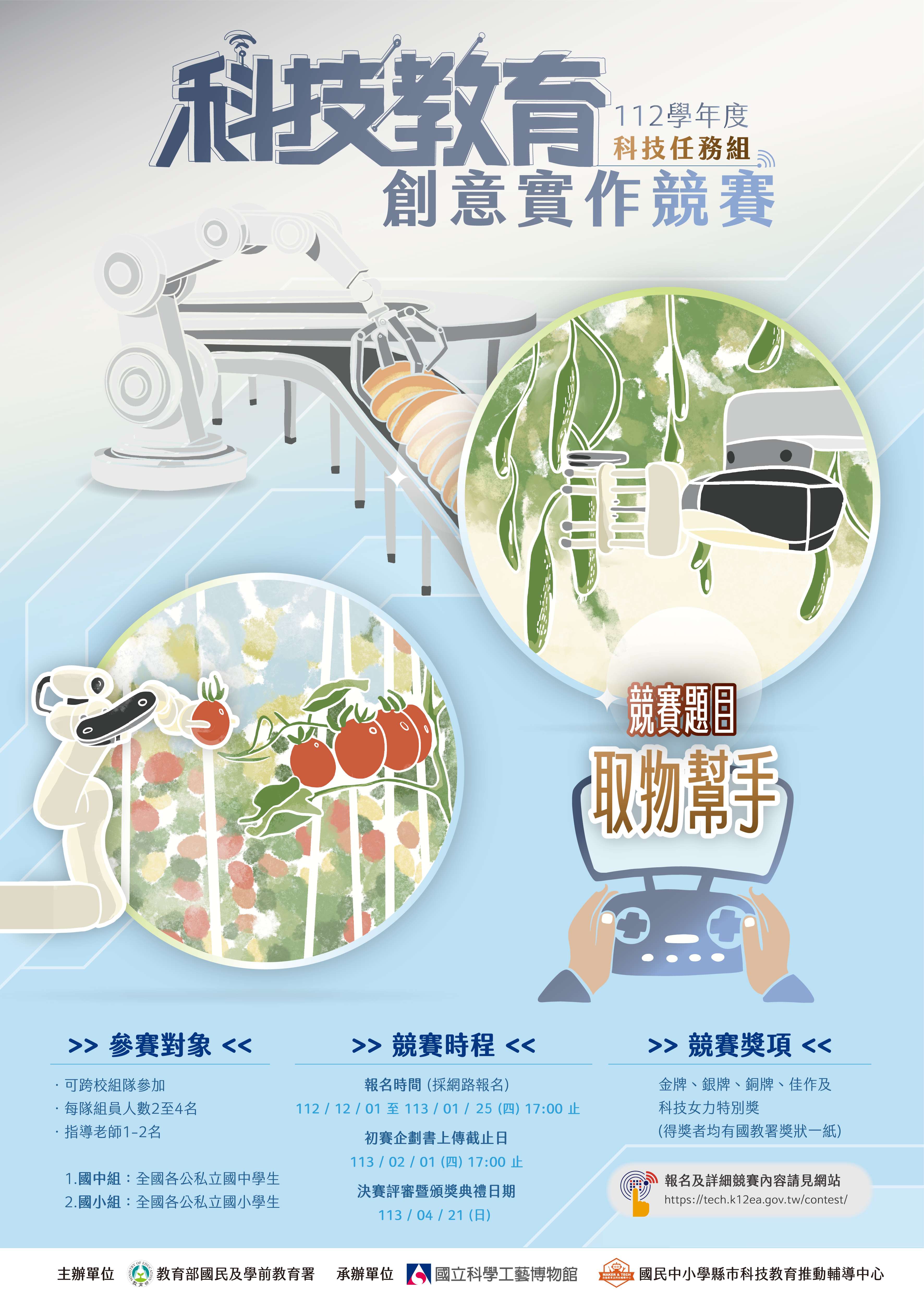 二、旨揭競賽原報名時間至112年1月18(星期四)截止,現延長至113年1月25日(星期日)下午5時止,競賽資訊詳見競賽網站(網址:https://tech. k12ea.gov.tw/contest /),請鼓勵所屬師生踴躍報名參加。