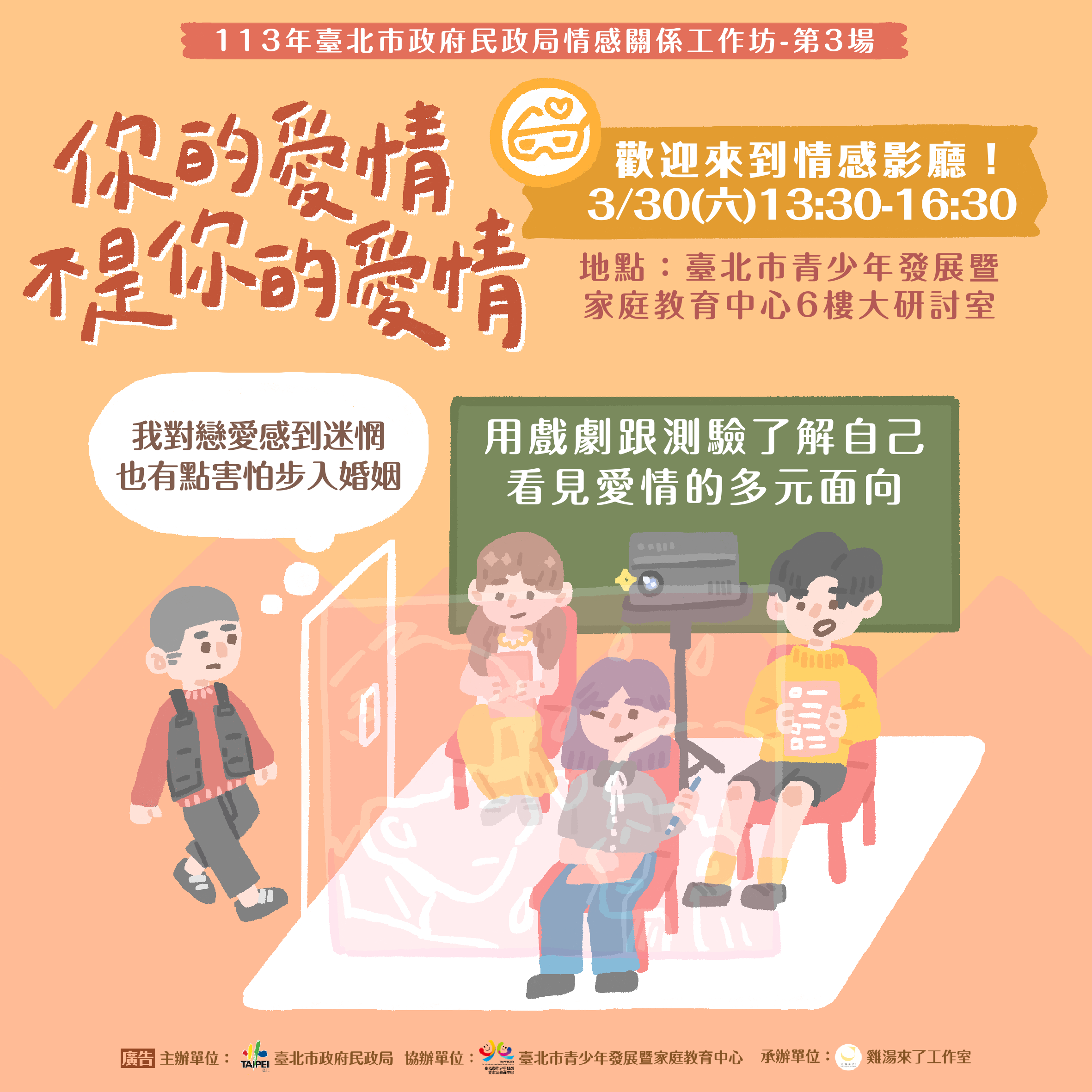 二、第3場次工作坊自即日起至113年3月3日受理報名,採線上表單報名,凡在臺北市設籍、居住、就學及就業,25至45 歲之單身市民即可報名參加,報名連結與活動詳情請參閱簡章及本局官網(https://ca.gov.taipei/cp.aspx? n=A1CCB8CCA85C6579)。