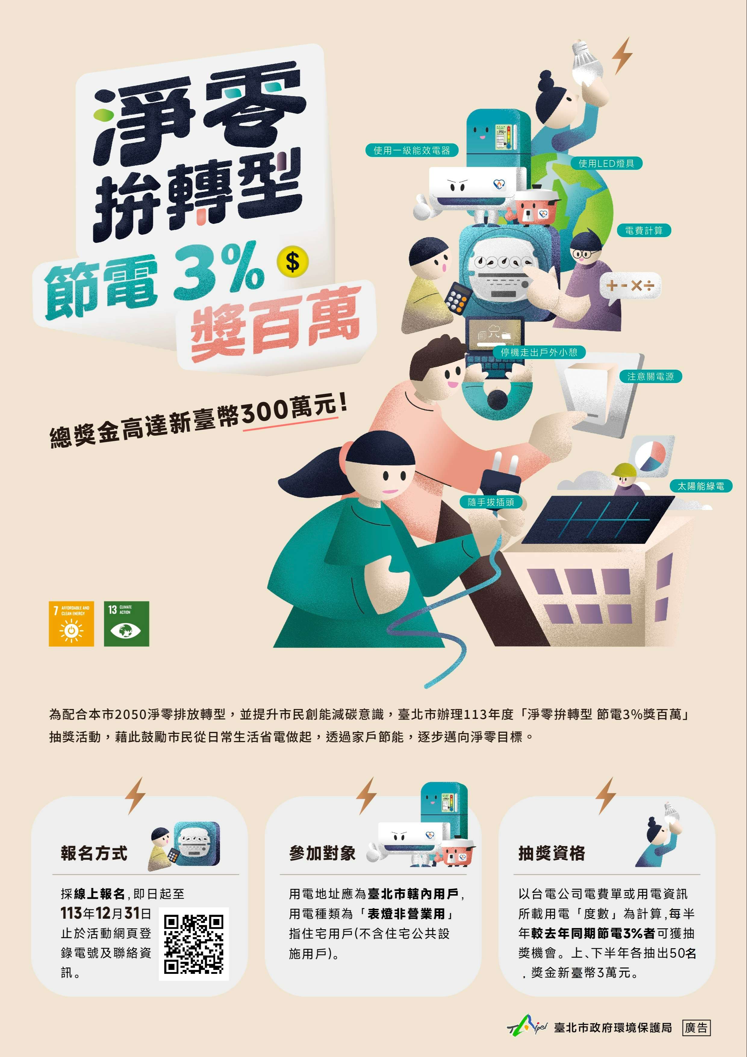 一、為鼓勵市民落實節能減碳行動,本局推出「淨零拚轉型節 電3%獎百萬」抽獎活動(網址:https://energysaving. gov.taipei/),即日起至113年12月31日辦理,提供活動 海報及30字、60字、90字文稿,請貴機關學校協助運用所屬管道(電子看板、跑馬燈、廣播插播稿等)宣傳登錄電 號。