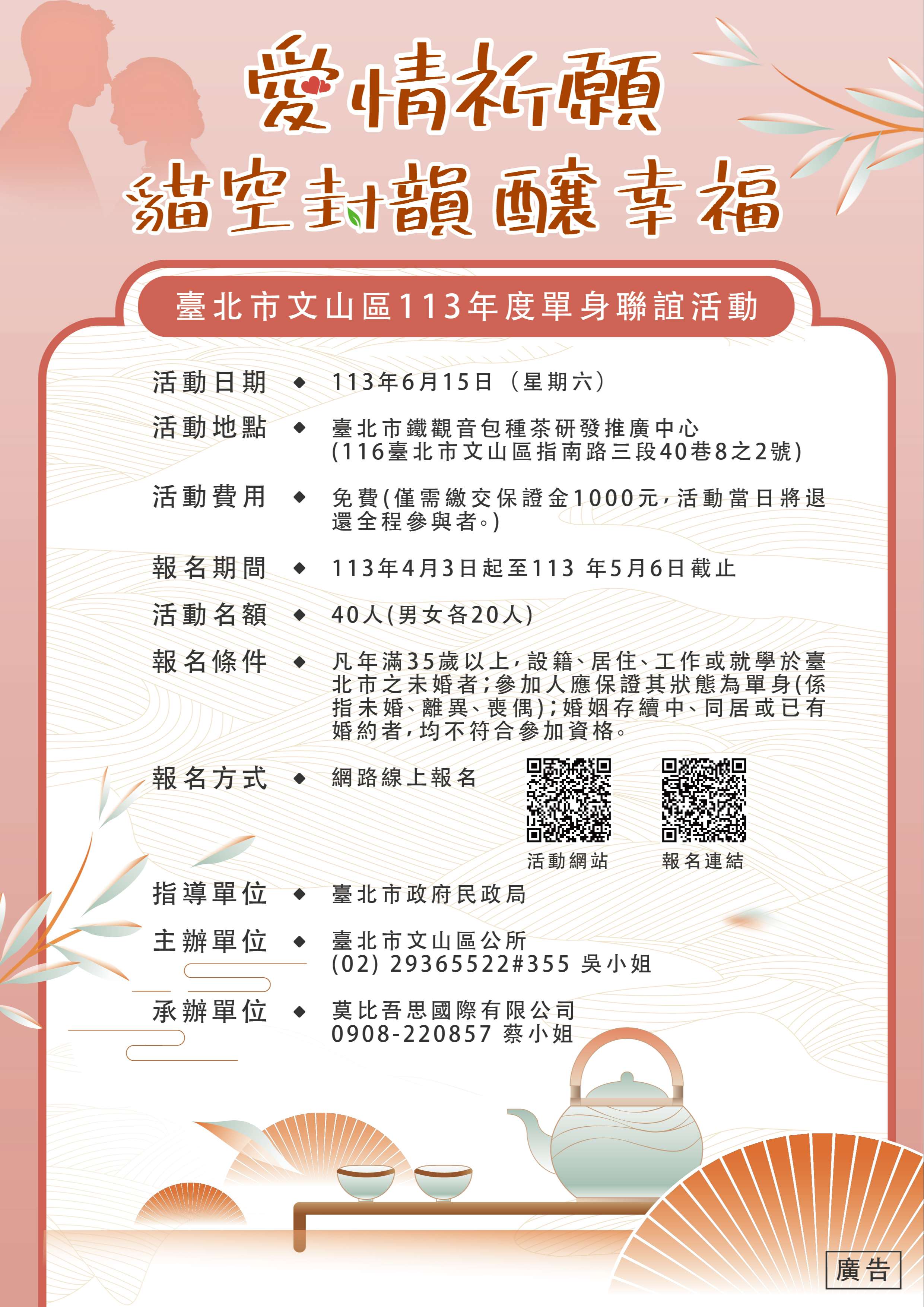 臺北市文山區公所113年度單身聯誼活動『愛情祈願~ 貓空封韻釀幸福』,將於113年6月15日(星期六)上午10 時至下午4時假臺北市鐵觀音包種茶研發推廣中心辦理,線 上報名時間自113年4月3日(星期三)中午12時起至113年5月6日(星期一)下午2時或額滿為止,凡年滿35歲以上總計40個名額,男女各20人,免費參加,活動詳情請見文山區公所官網或電洽2936-5522轉355吳小姐。