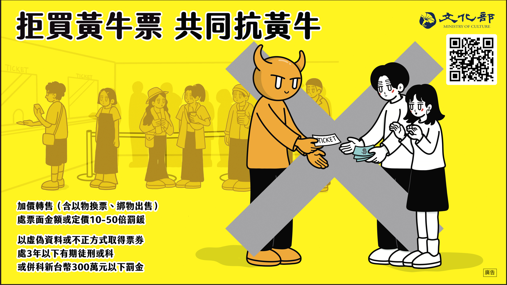 三、為避免青年學子因不瞭解旨揭相關規定,誤觸法網,請青少年及學生不要購買黃牛票、販售票券 不能加價、不得以不正方式(例如使用外掛程式)購買藝 文表演票券,以免觸法。