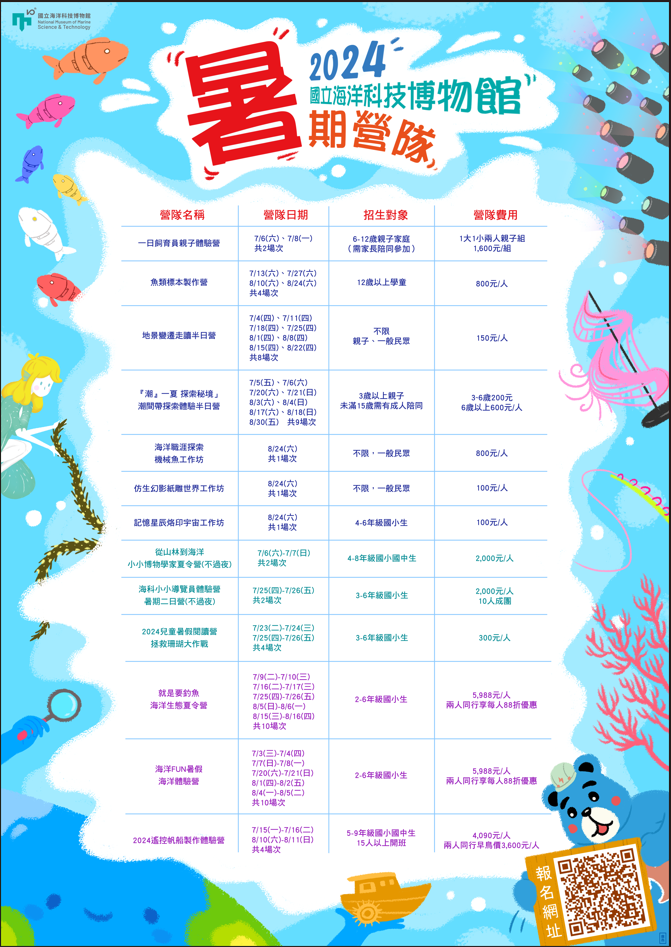 課程活動分成一天、兩天的體驗活動及兩天的過夜活動; 有超過40梯次的海科館特色營隊活動讓全民體驗,活動網 站:https://www.nmmst.gov.tw/chhtml/newsdetail/556 /8275 內有更詳細的說明。
