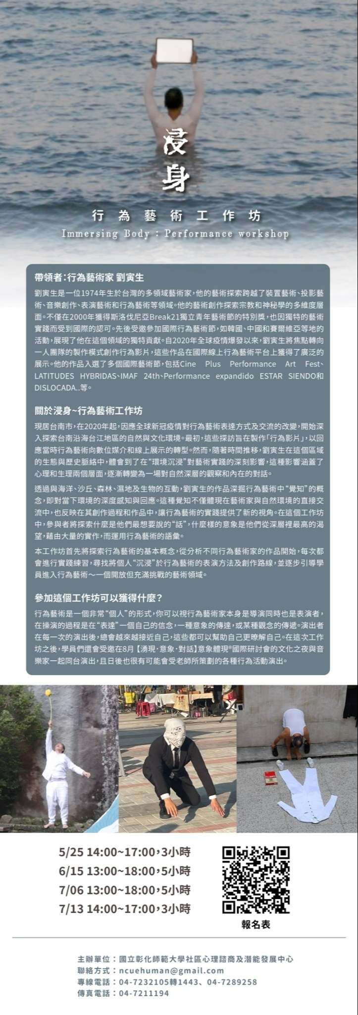 三、參加對象:本工作坊不限專業人員,凡對「浸身~行為藝 術工作坊」主題有興趣者,歡迎參加。