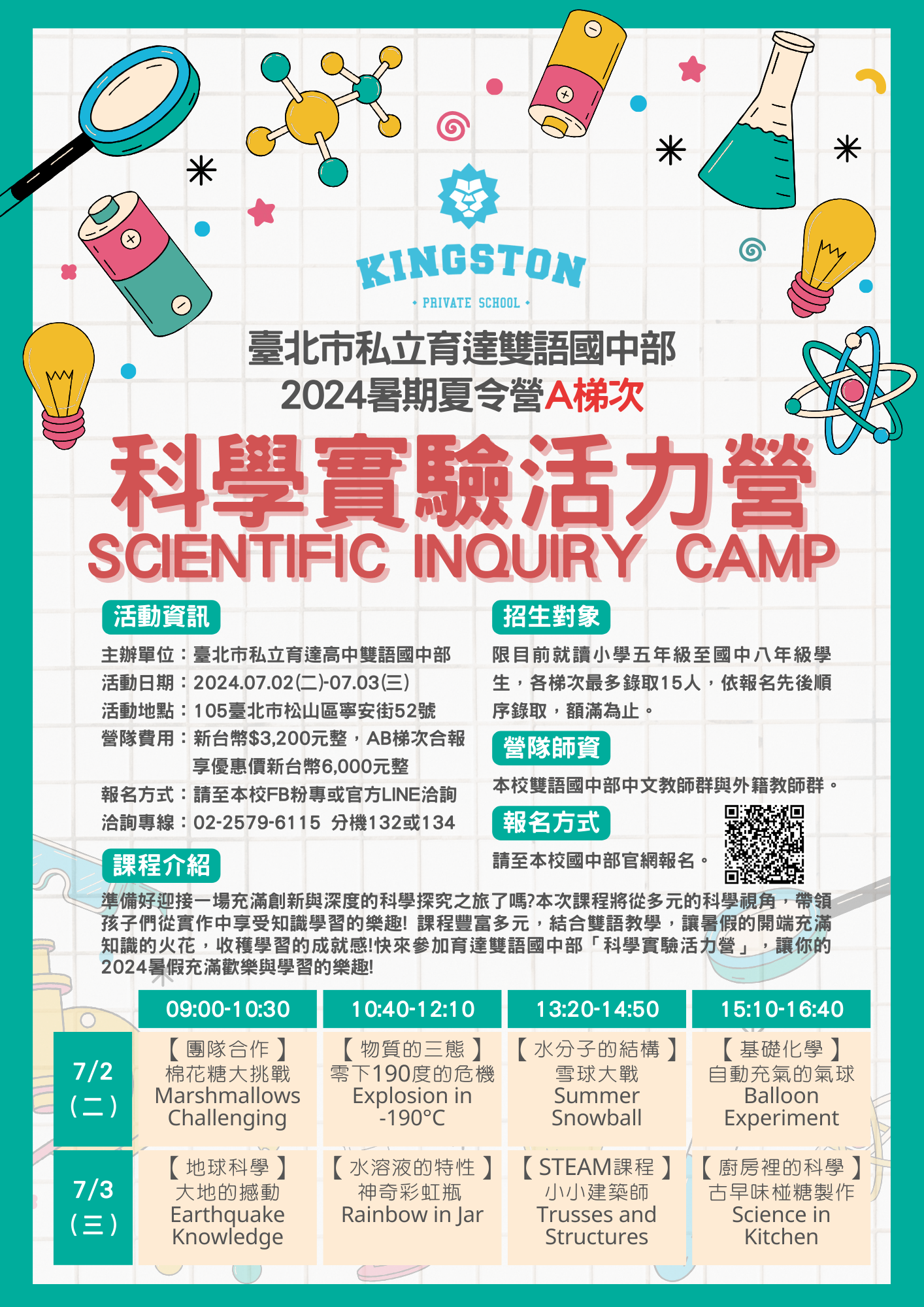 (一)科學實驗活力營:113年7月02日至7月03日,共2天,每天9:00―16:40。
