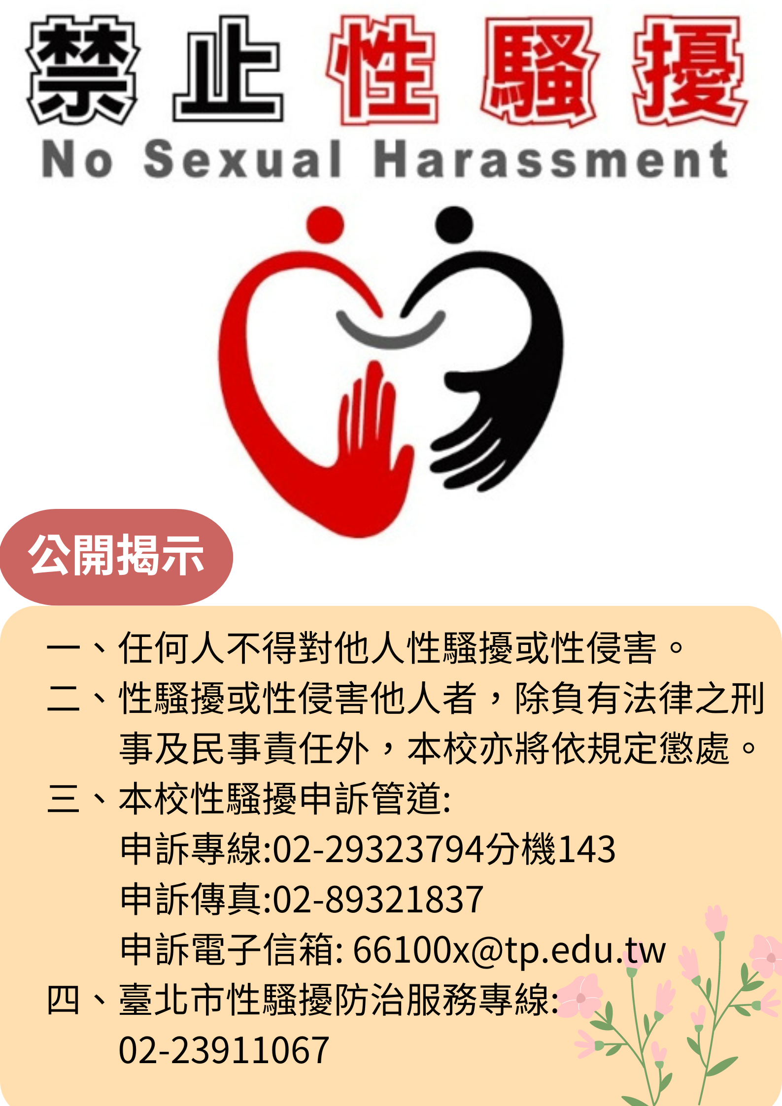 三、檢附性騷擾防治海報、本校性騷擾防治、申訴及懲處措施、本府人事處整理之「職場性騷擾形式及常見態樣」各1份。