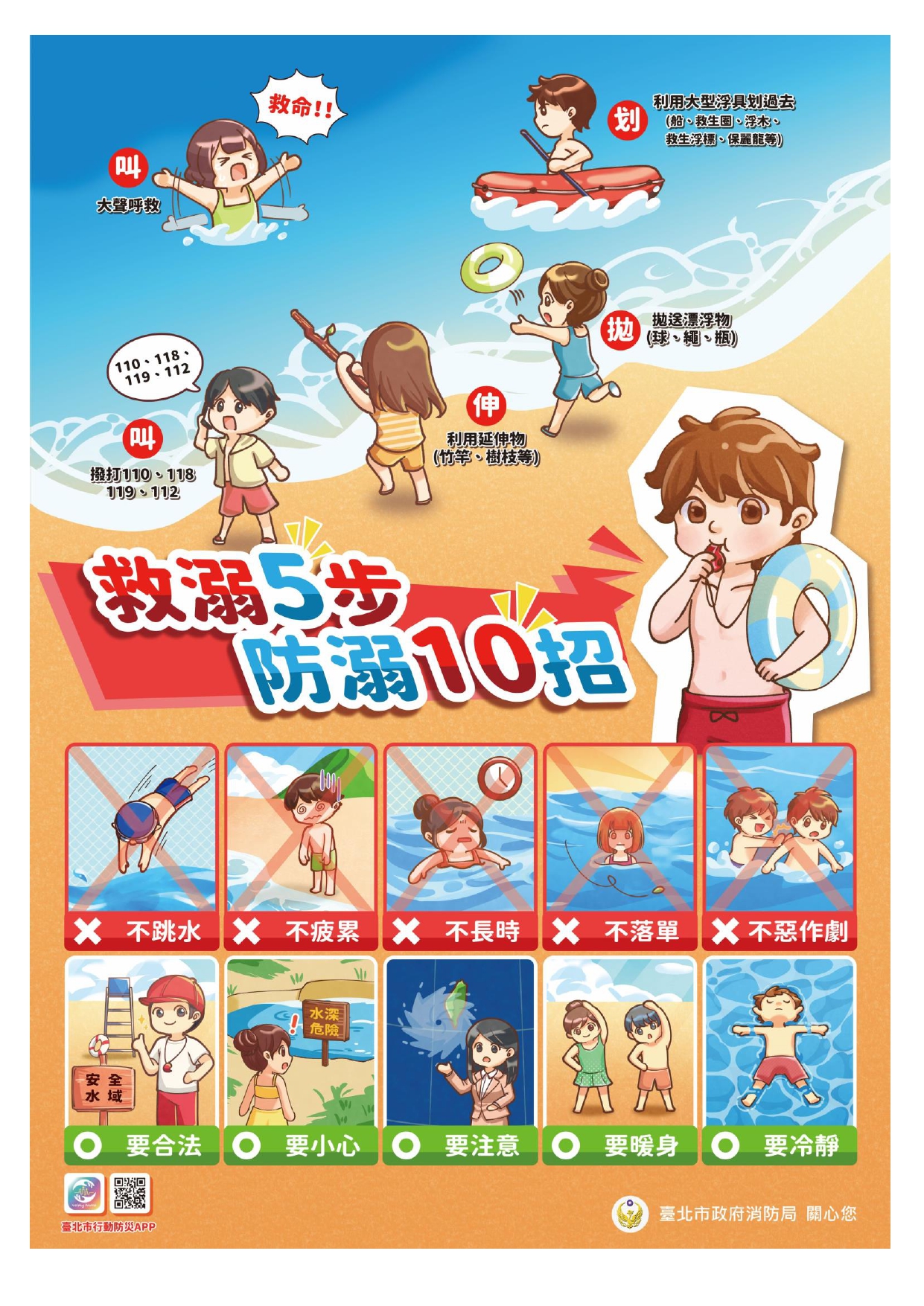 從事水域休憩活動應結伴同行,若發現有人溺水,應大聲呼救不可冒然下水救人;可請人打 119 或手機直撥 112向消防單位求援,並察看周圍是否有救生器材如救生繩、救生圈或竹竿等其他替代物作岸上施救。
