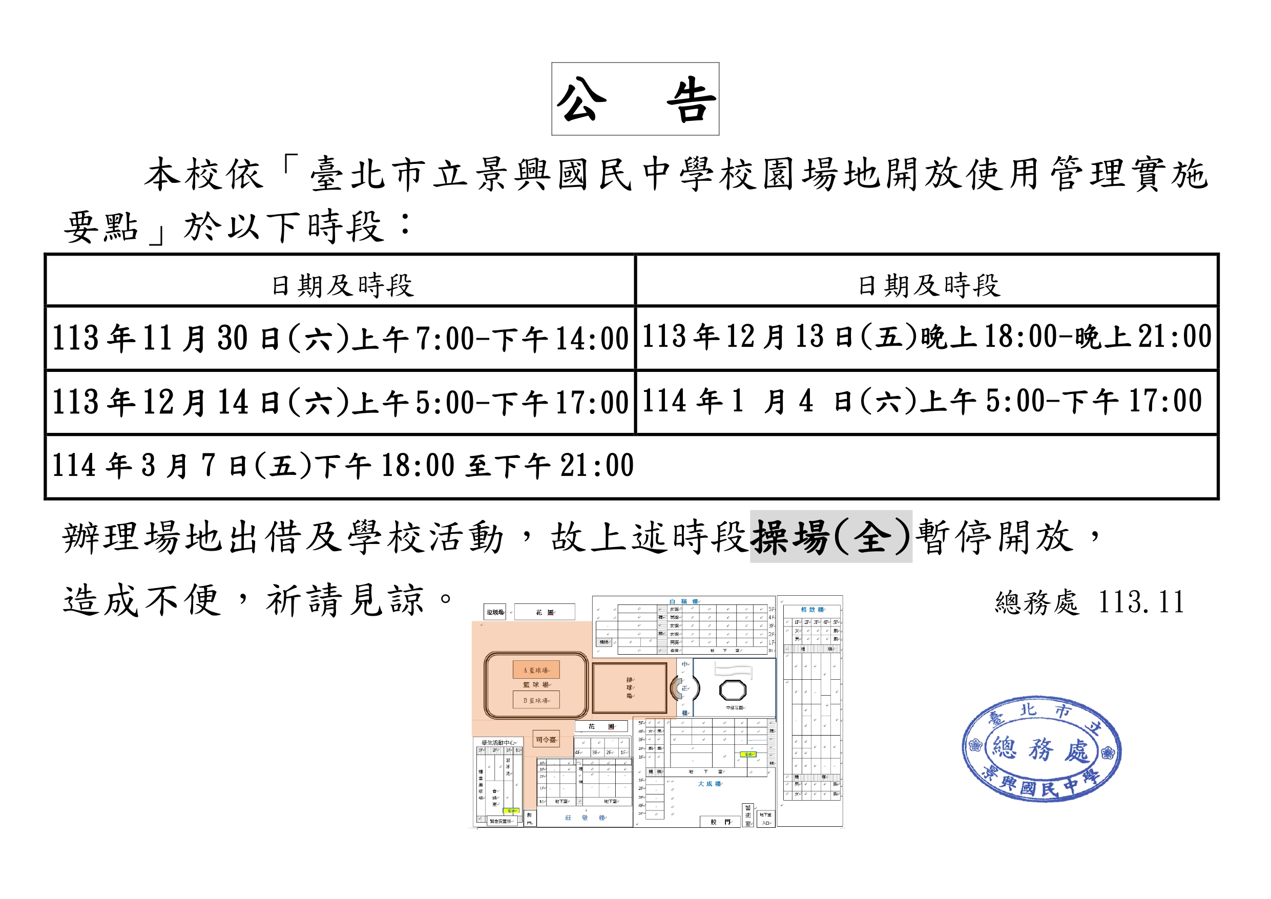 並新增114年1月4日(六)、114年3月7日(五)辦理場地租借及學校活動,