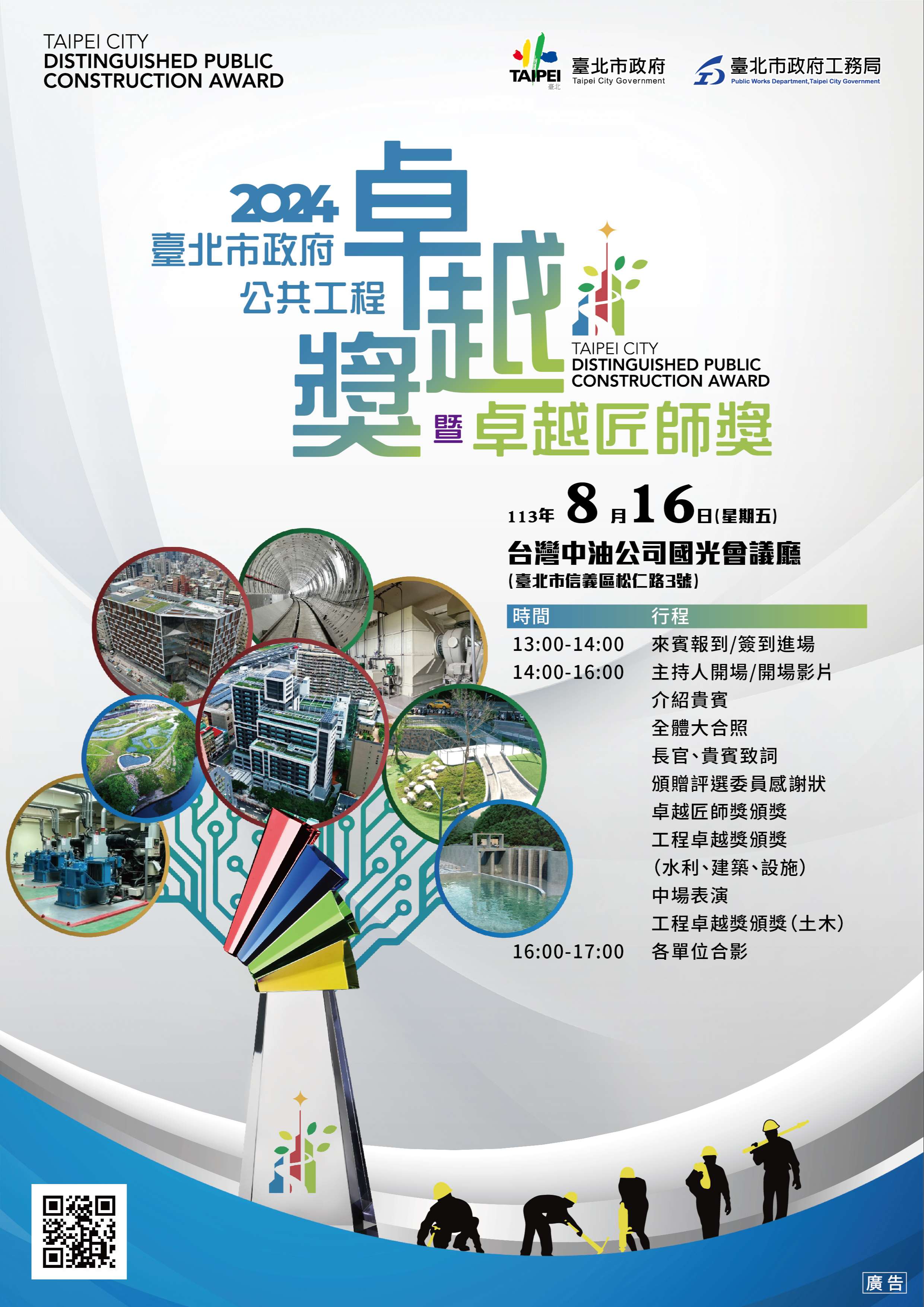 二、市府為精進公共工程品質、賦予工程人員榮譽與使命感並 促進良性競爭,旨揭頒獎活動訂於113年8月16日(星期 五)下午2時,假台灣中油股份有限公司—國光會議廳(臺 北市信義區松仁路3號)舉行,屆時將公開表揚公共工程卓 越優秀之工程團隊與人員。
