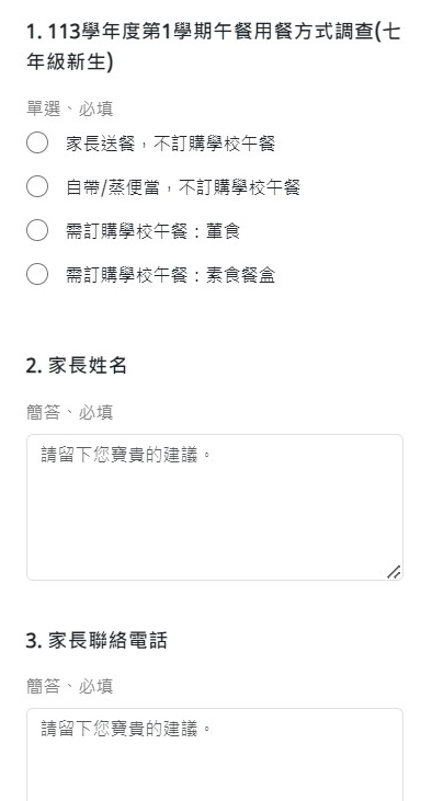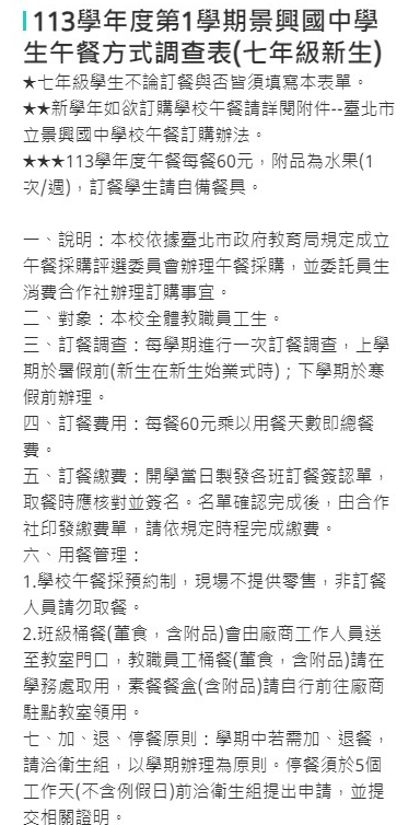 【113學年度第1學期景興國中學生午餐方式調查表(七年級新生)】