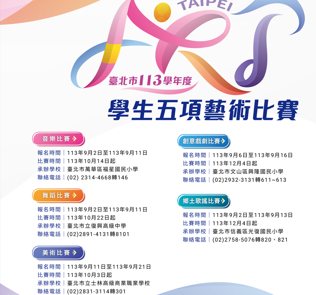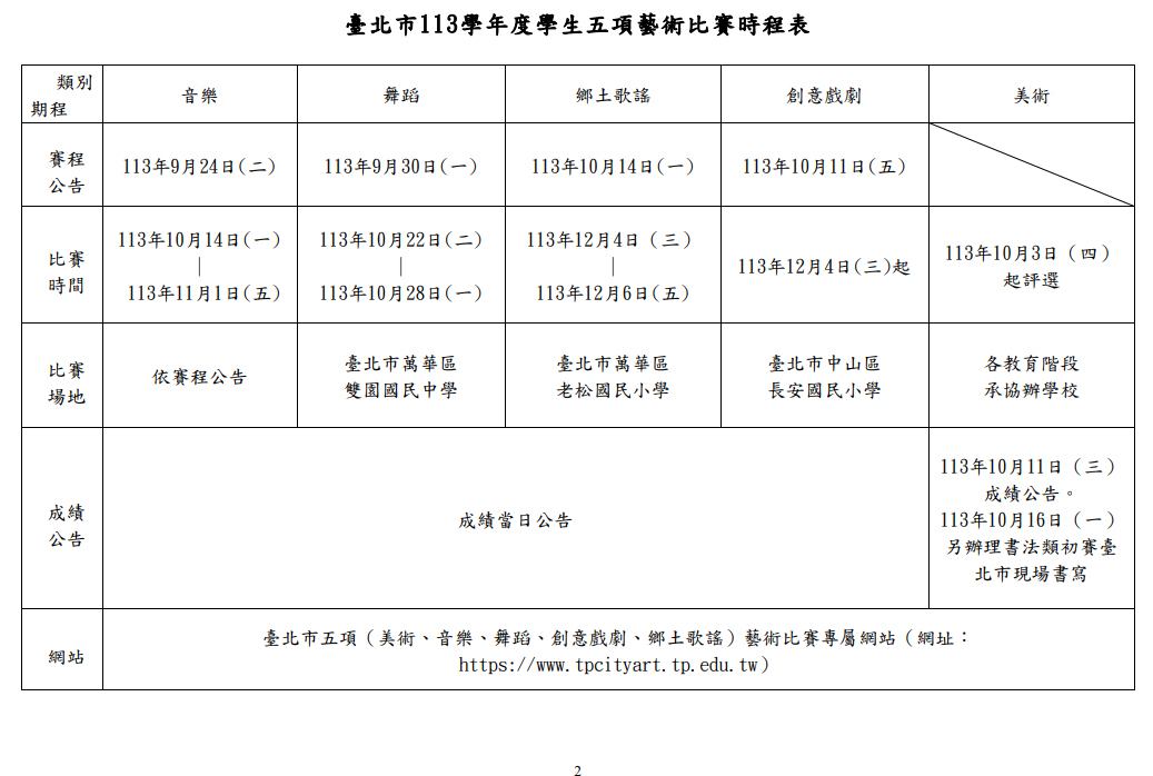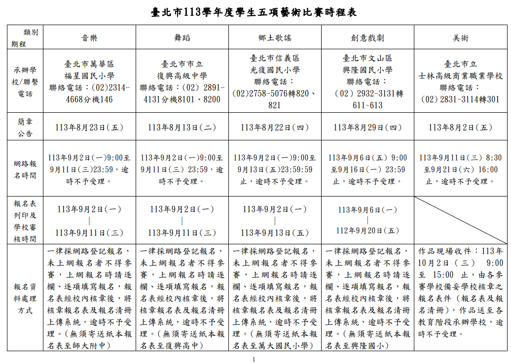 二、本市學生五項藝術比賽自113年9月2日(星期一)起陸續開放網路報名。相關訊息及作業時程,請至臺北市五項藝術比賽網站https://www.tpcityart.tp.edu.tw/查詢,逾期不受理。