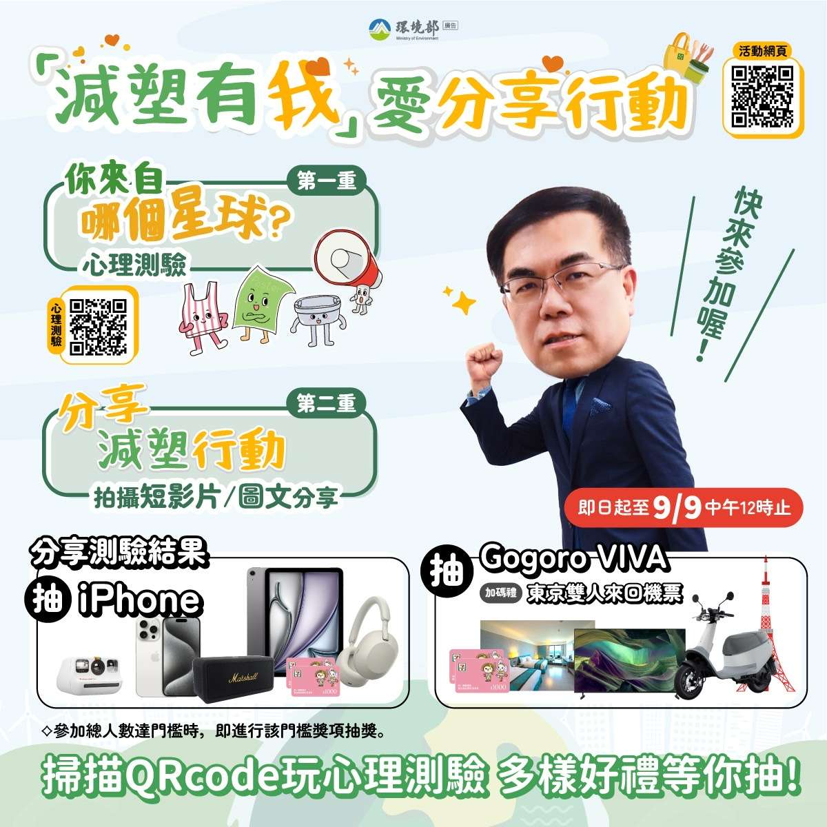 二、環境部為鼓勵社會大眾及莘莘學子一起跟上全球減少塑膠的風潮,特辦理「減塑有我」愛分享行動,可透過臉書 (Facebook)、Instagram(IG)等社群媒體,拍攝個人生 活中減塑短影片、減塑生活照片,並可透過參加「你來自 哪個星球?」心理測驗遊戲,瞭解並發覺屬於自己獨特的 環保行動,歡迎民眾邀請親朋好友一起在生活中響應減塑 行 動,參加旨揭活動拿大獎。