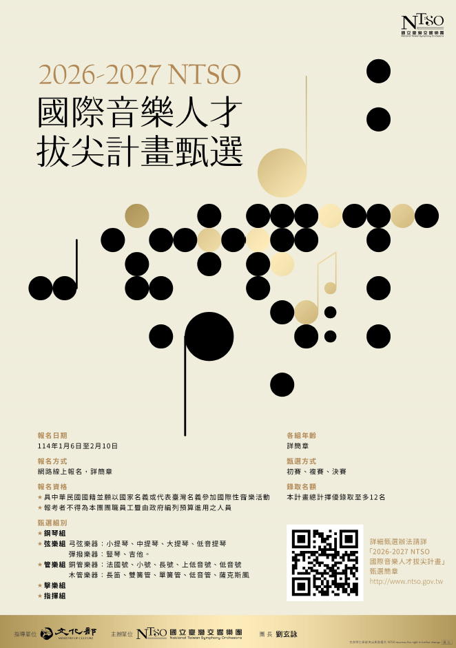 一、「2026-2027 NTSO國際音樂人才拔尖計畫」甄選採網路報名,報名時間自民國114年1月6日起至2月10日止,詳 情請逕上網站(http://www.ntso.gov.tw/)查詢及報 名。