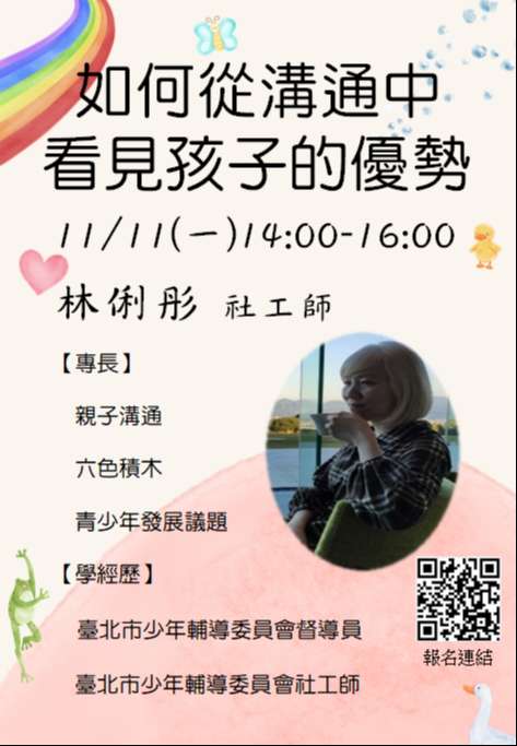 (二) 11/11(一)14:00-16:00《 如何從溝通中看見孩子的優勢 》林俐彤 社工師。