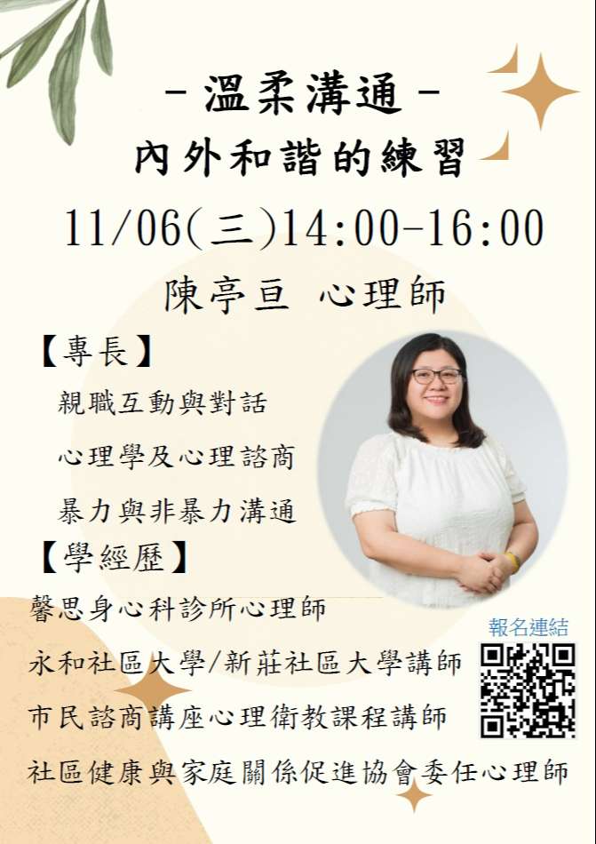 (一) 11/06(三)14:00-16:00《 溫柔溝通–內外和諧的練習 》陳亭亘 心理師。