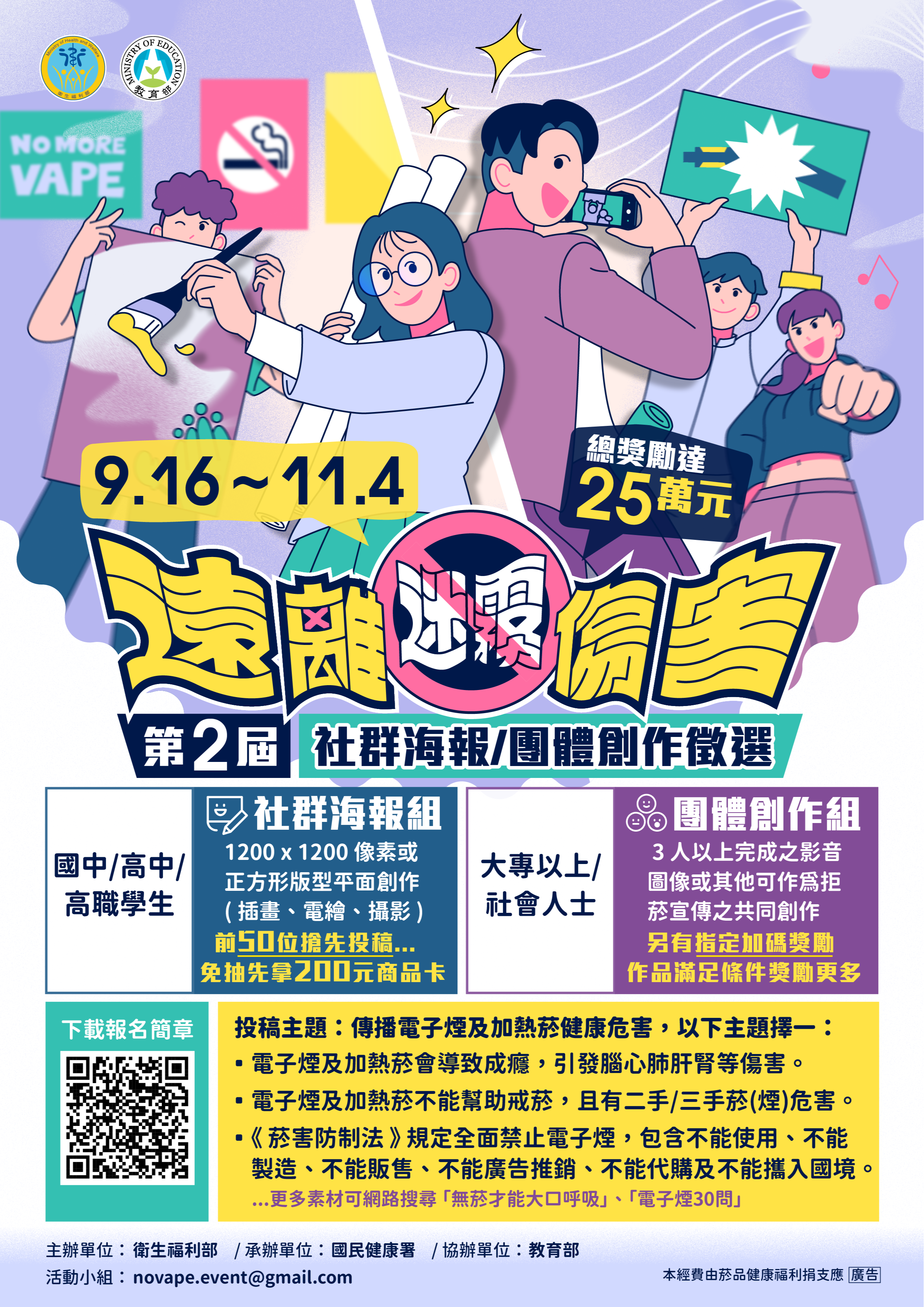 二、為避免電子煙、加熱式菸品等新興菸品入侵校園,造成健 康危害,衛生福利部(承辦單位:衛生福利部國民健康 署)爰與教育部共同辦理旨揭活動(徵選簡章如附件1、活 動海報如附件2),以宣導電子煙及加熱式菸品等新類型菸 品之危害,共同維護青少年健康。活動相關內容如下: