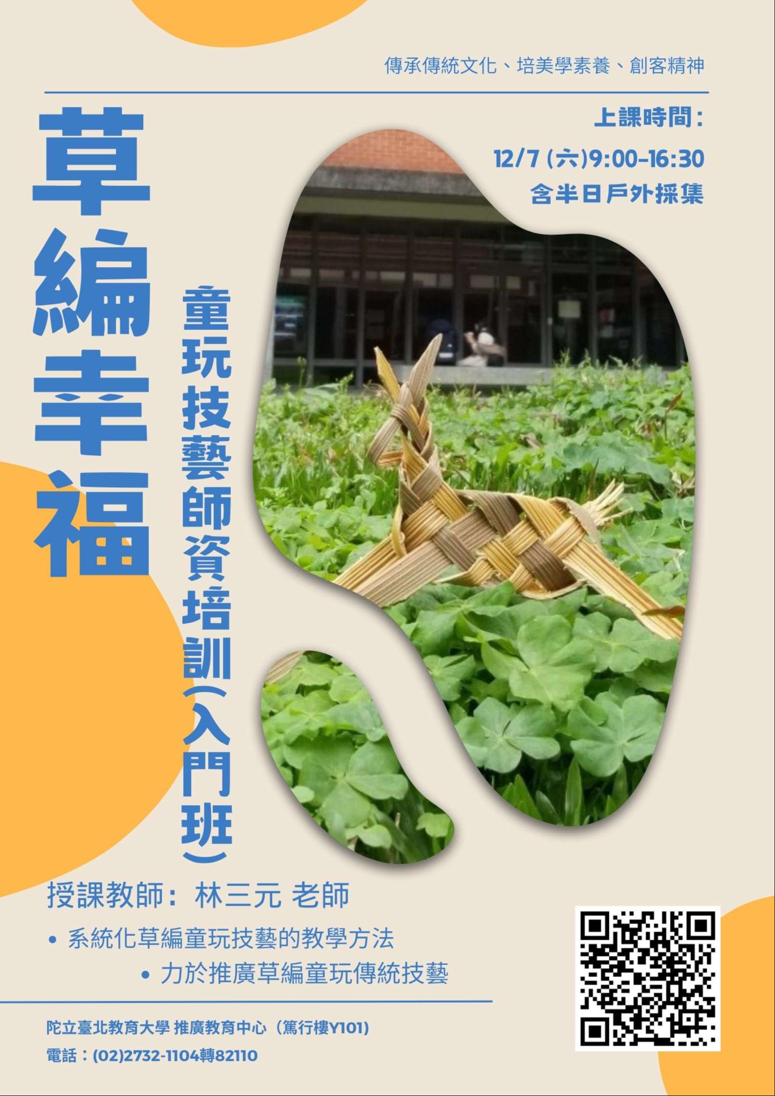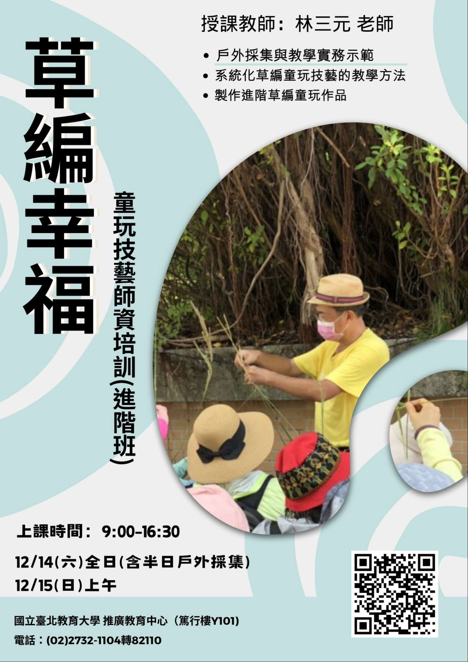 證明書。課程特聘專業草編達人「草編CEO林三元老師」親授,包含戶外採集、戶外與教室型態的教學示範、教學計