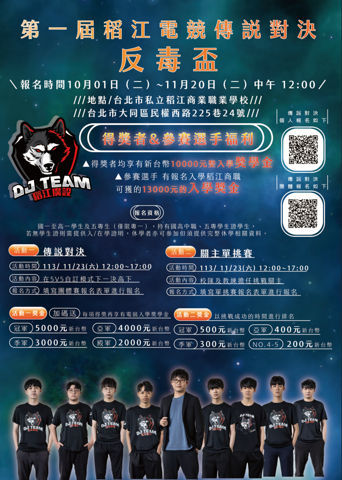 2、 第一屆稻江電競傳說對決反毒盃電競大賽關主單挑賽 報名QR code: