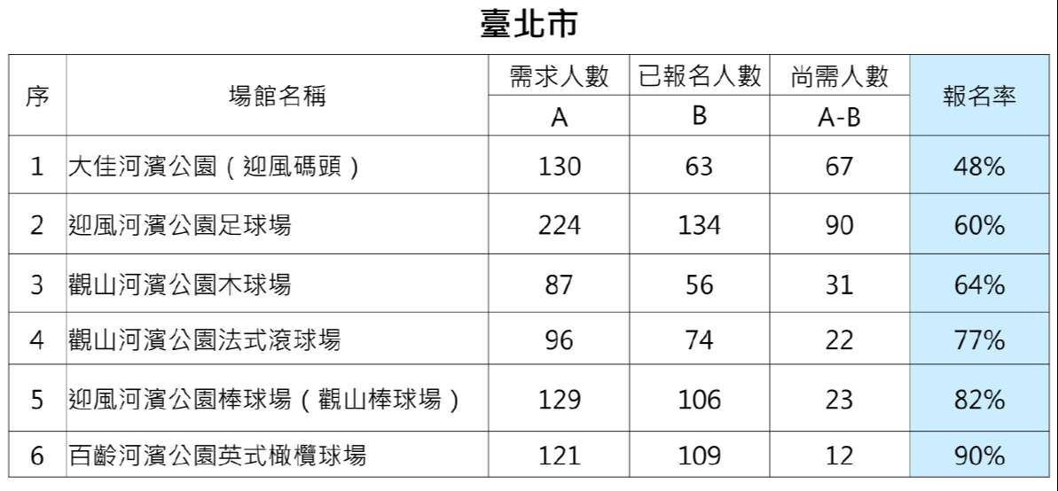 二、旨揭賽會本市共有28個賽館,尚有6個場館尚有志工缺額, 請各單位積極轉知所屬人員及家眷踴躍報名擔任志工參與 盛會。