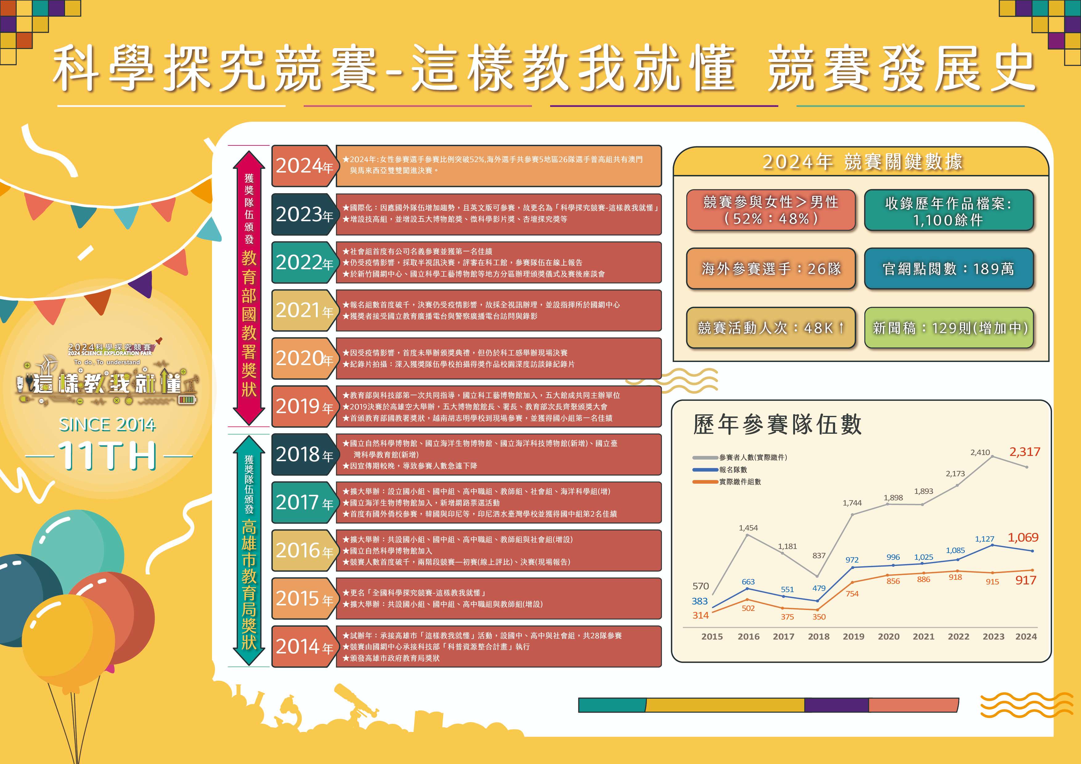 一、旨揭競賽活動自2014年起迄今已辦理10年,指導單位為教育部國民及學前教育署,共同主辦單位為國立自然科學博物館、國立海洋生物博物館、國立海洋科技博物館及國立臺灣科學教育館、國立科學工藝博物館、國家高速網路與計算中心、國立臺灣師範大學及國立高雄師範大學。競賽分為國小、國中、普高、技高、教師及大專/社會組。