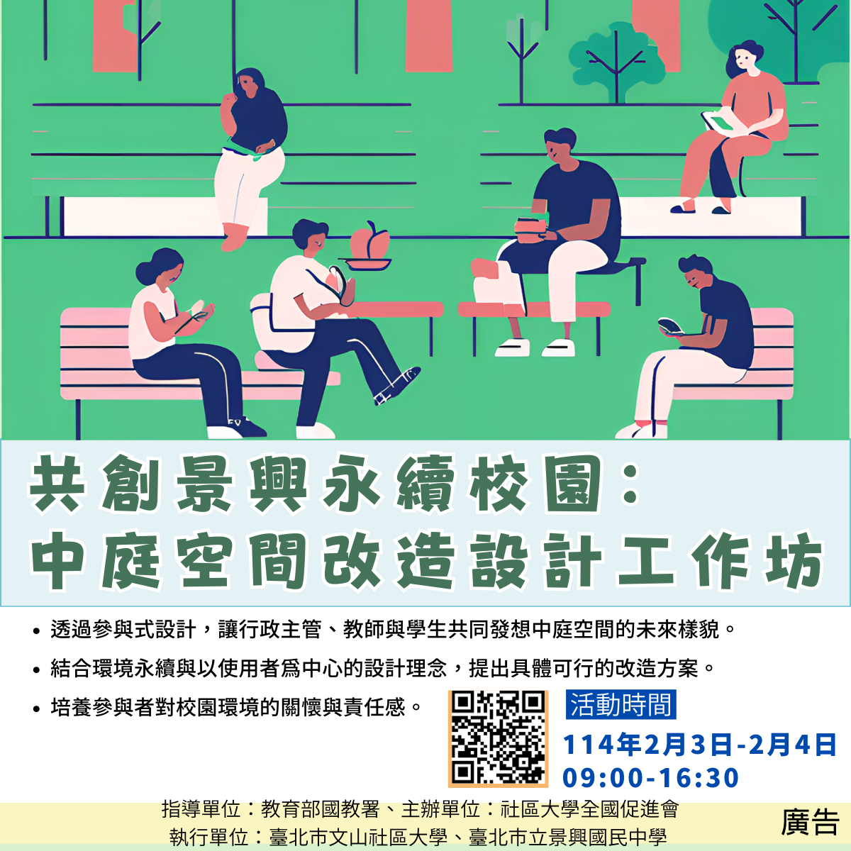 本校將於114年2月3-4日辦理「共創景興永續校園:中庭空間改造設計工作坊」,本次活動無需繳交費用,並提供午餐。歡迎本校學生踴躍報名。詳情請見附件電子檔。