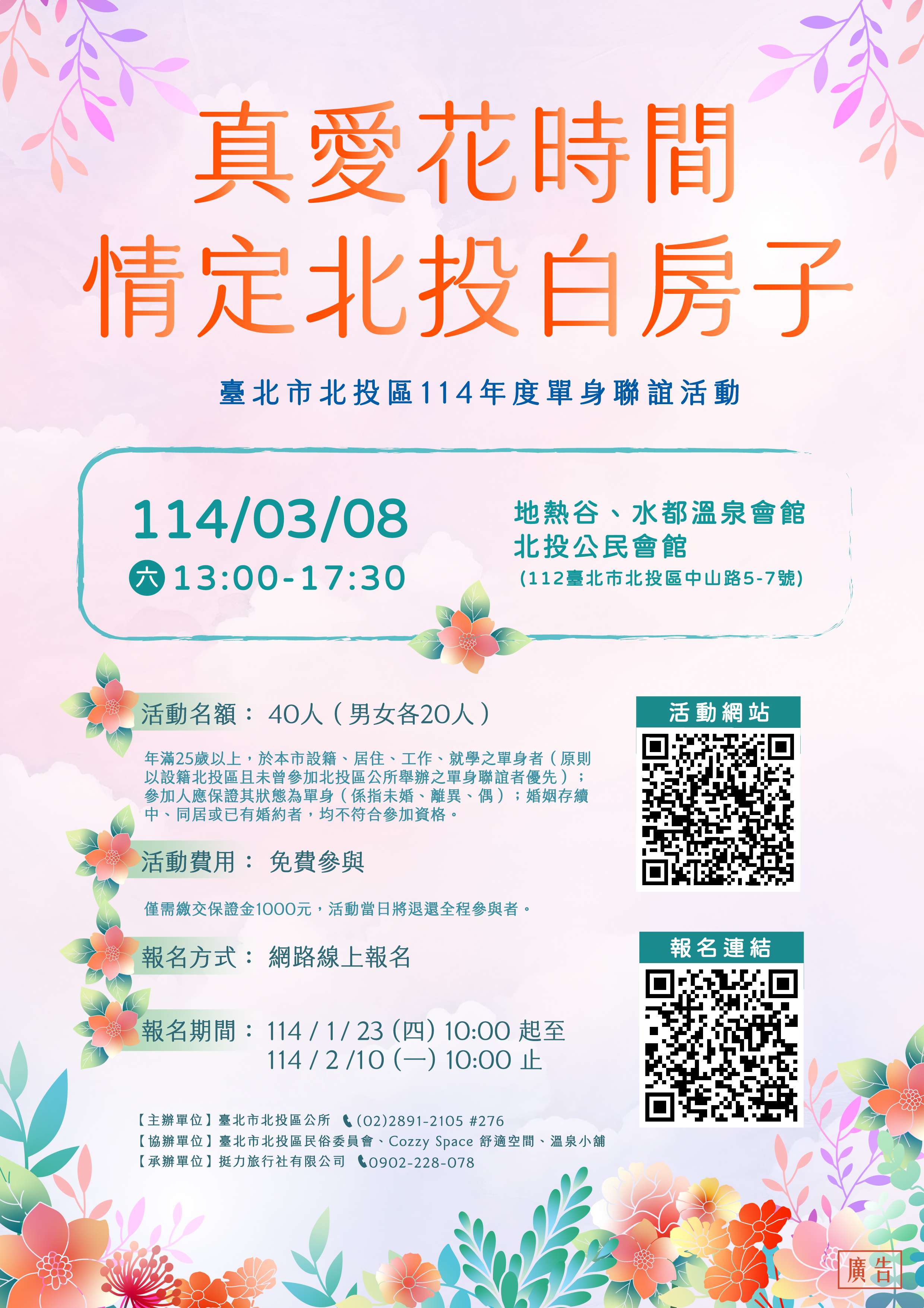 三、北投區公所114年度第1場單身聯誼活動「真愛花時間:情定北投白房子」,請單身同仁踴躍參加。