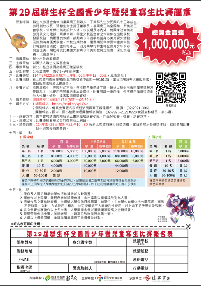 六、比賽簡章公告於 群生基金會網站首頁 http://ischool.fhvs.ntpc.edu.tw /ischool/publish_page/193/,敬請下載查閱。