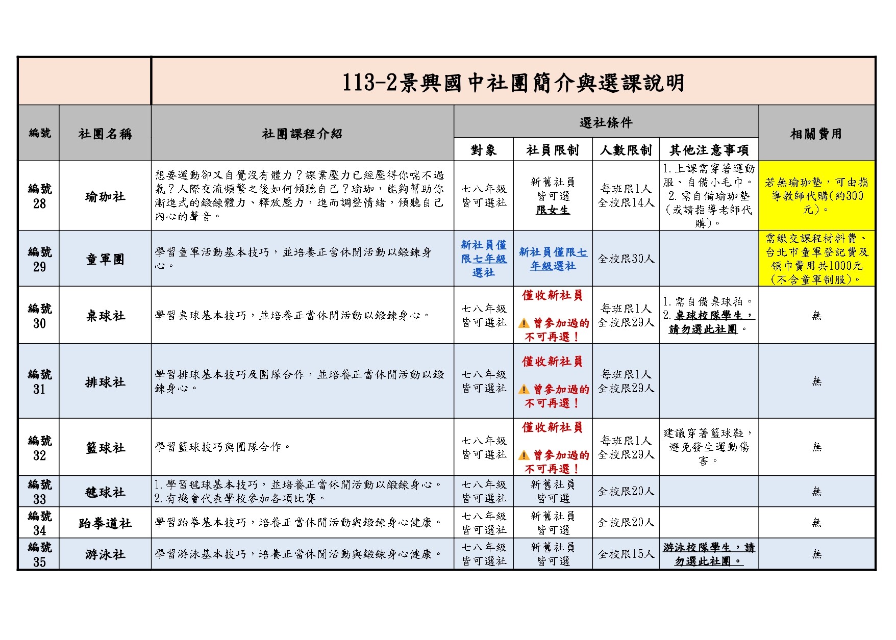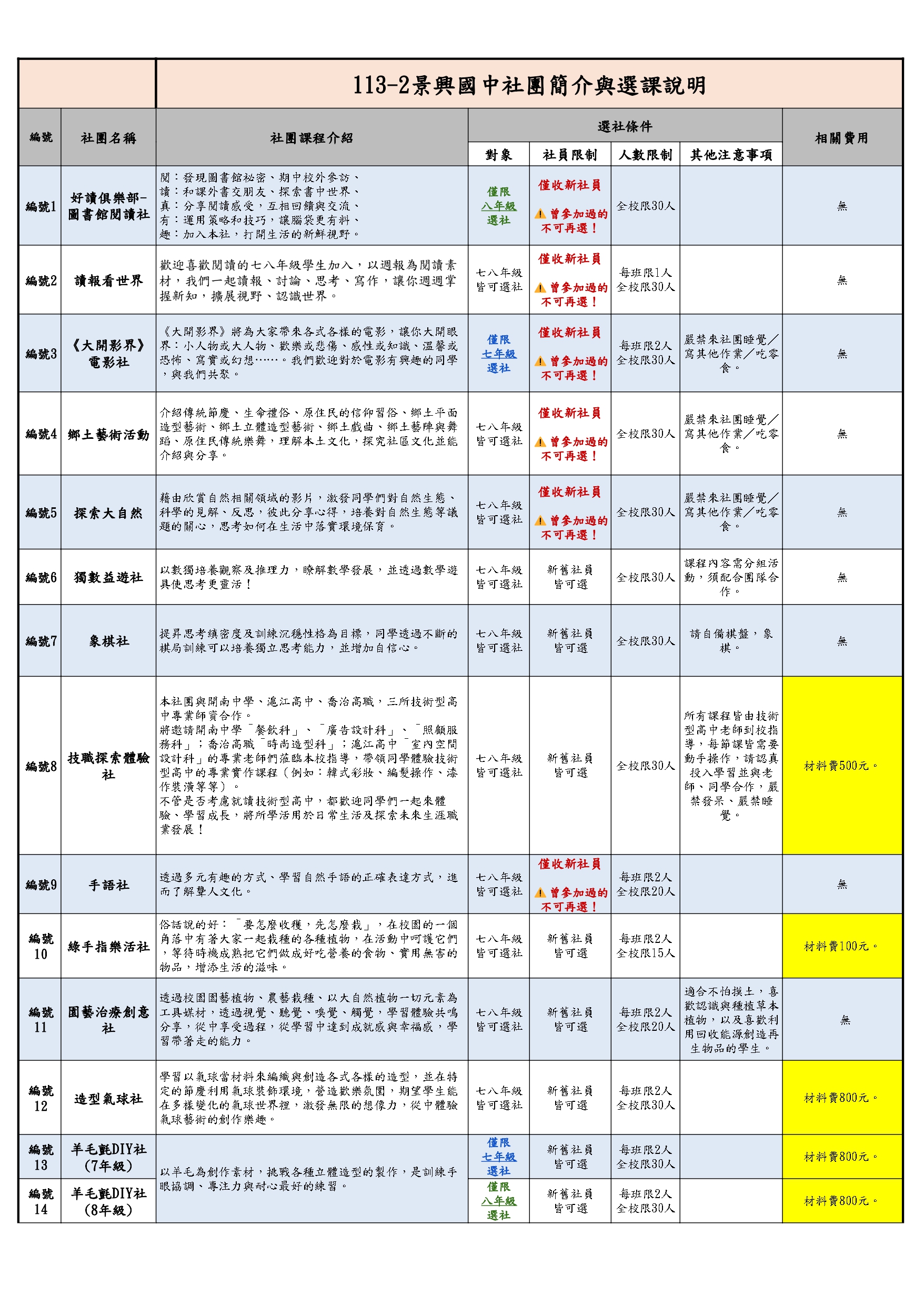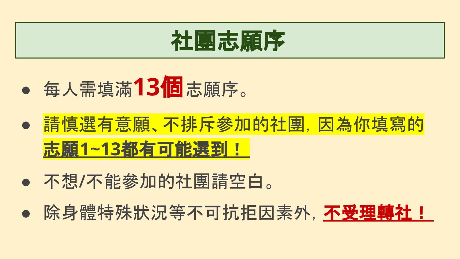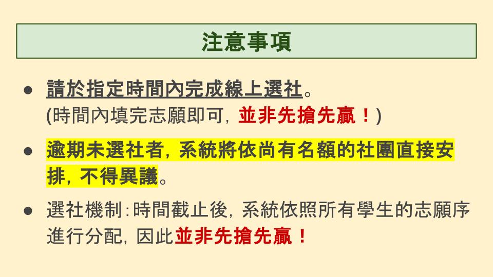 ⚠️逾期未選社者,系統將依尚有名額的社團直接安排,不得異議⚠️