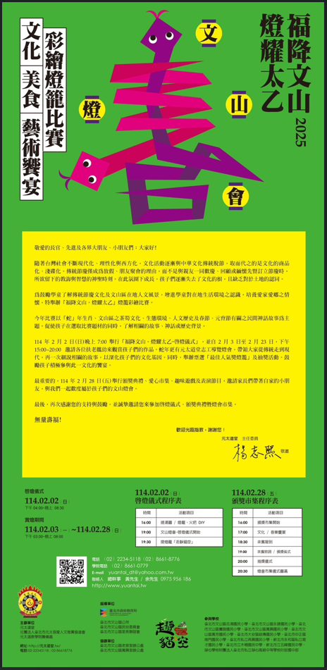 (一)點燈儀式:114年2月2日下午4時至6時,屆時將安排傳統 元宵燈節搓元宵、持火把、走靜貓空等活動。