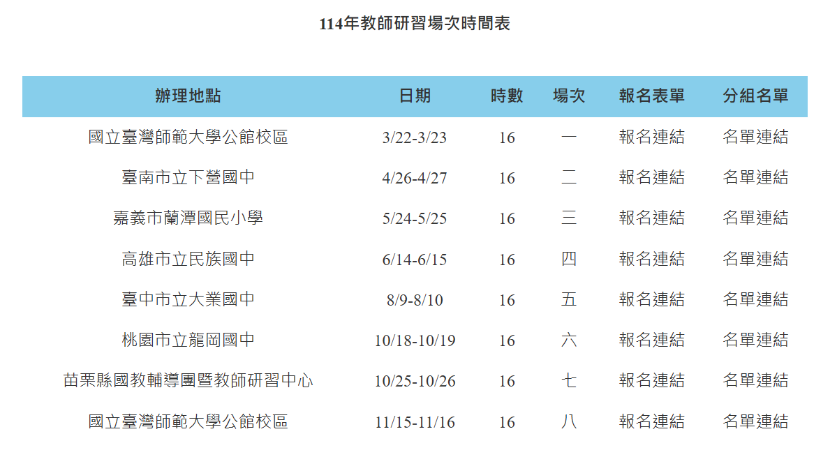(一)第一場次師大1場:114年3月22日(星期六)至3月23日(星期日);研習地點:本校公館校區;報名連接:https://forms.gle/Ck2Hqvra6drAwnfDA。