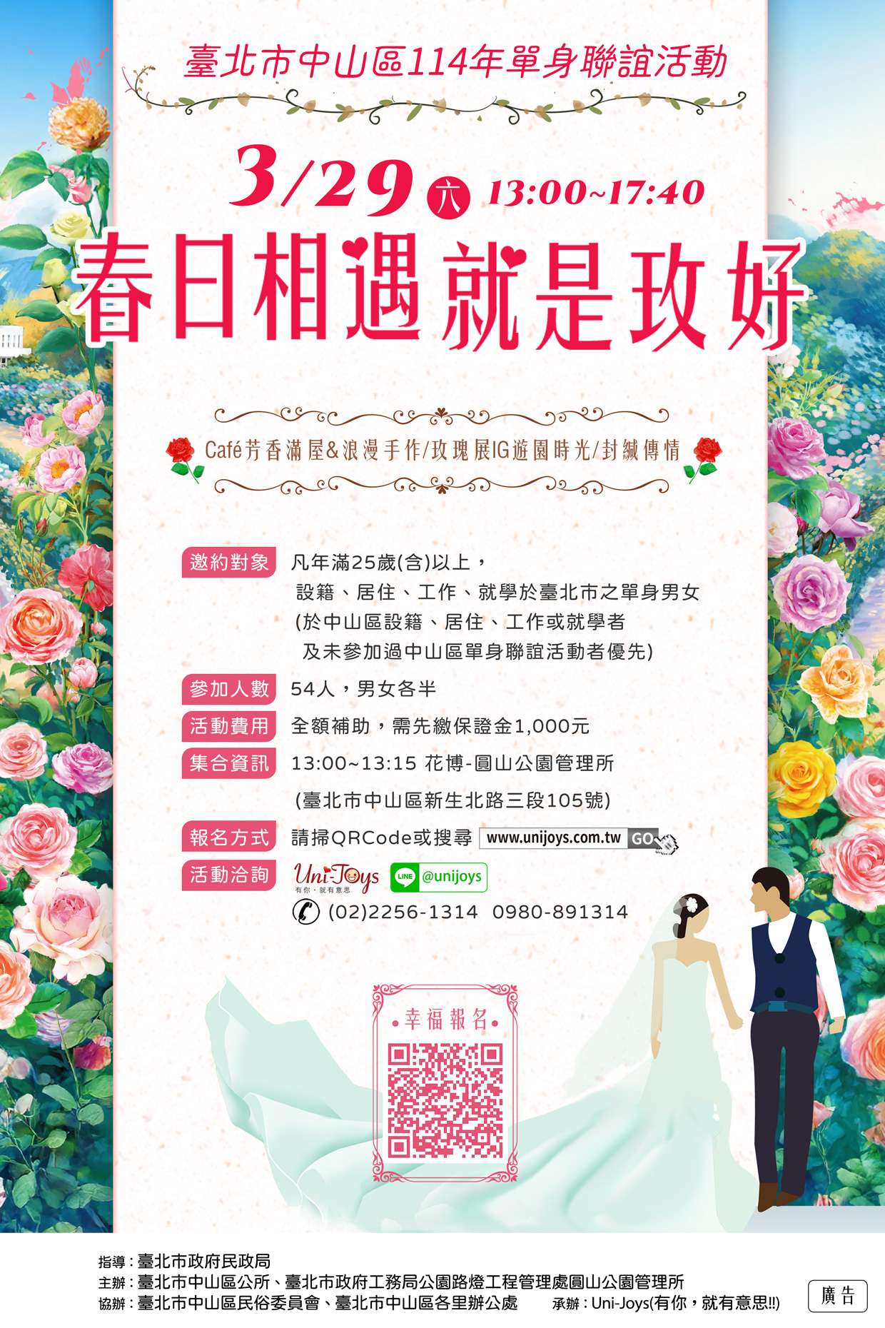 四、活動名額為男、女各27人,共54人,歡迎年齡25歲以上設籍於本市或於本市居住、工作、就學之單身者踴躍報名參加(於中山區設籍、居住、工作或就學者及未參加過中山區單身聯誼活動者優先),活動詳情請參閱臺北市中山區公所官網(https://zsdo.gov. taipei/)或電洽(02)25031369分機593鍾小姐。