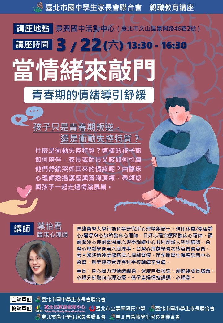 什麼是衝動失控特質?這樣的孩子該如何陪伴,家長或師長又該如何引導他們舒緩突如其來的情緒呢?由臨床心理師透過講座與實際演練,帶領您與孩子一起走過情緒風暴。