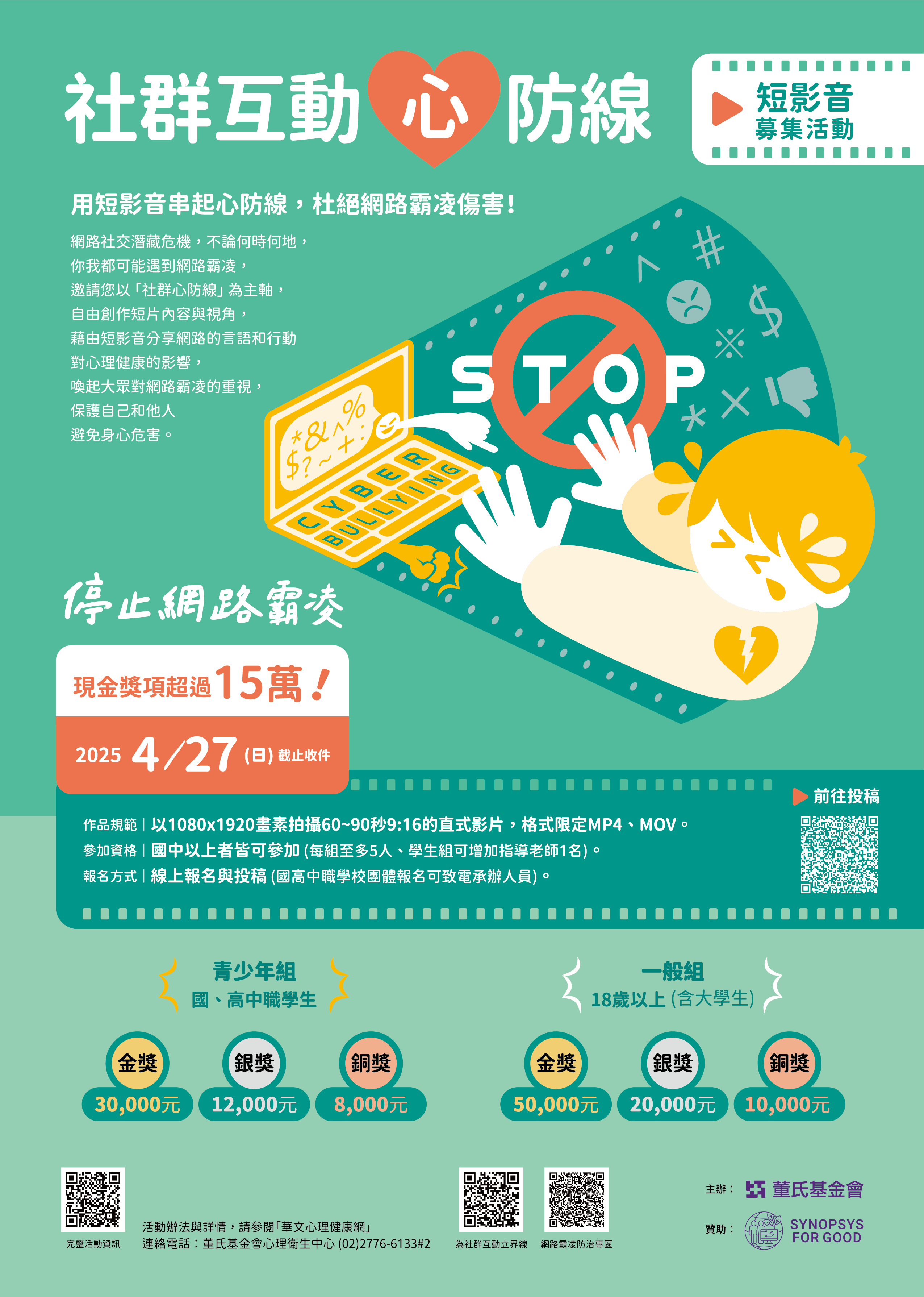 二、為鼓勵青少年透過活動參與了解預防網路霸凌傷害的重要性,本會今年舉辦「社群互動”心”防線」停止網路霸凌短影音募集活動,即日起開始收件至民國114年4月27日止,邀請學生與民眾拍攝60-90秒直式短影音投稿,得獎作品可獲得獎金,青少年組首獎現金三萬元、一般組現金五