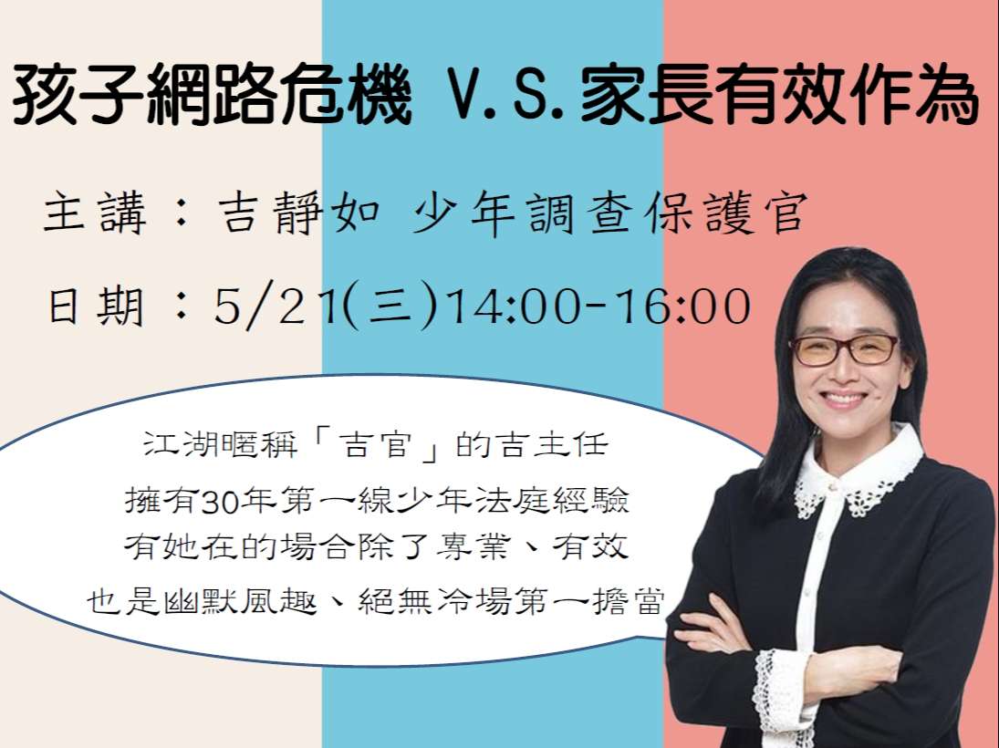 (二) 05/21(三)14:00-16:00《孩子網路危機v.s.家長有效作為》吉靜如調查保護官。