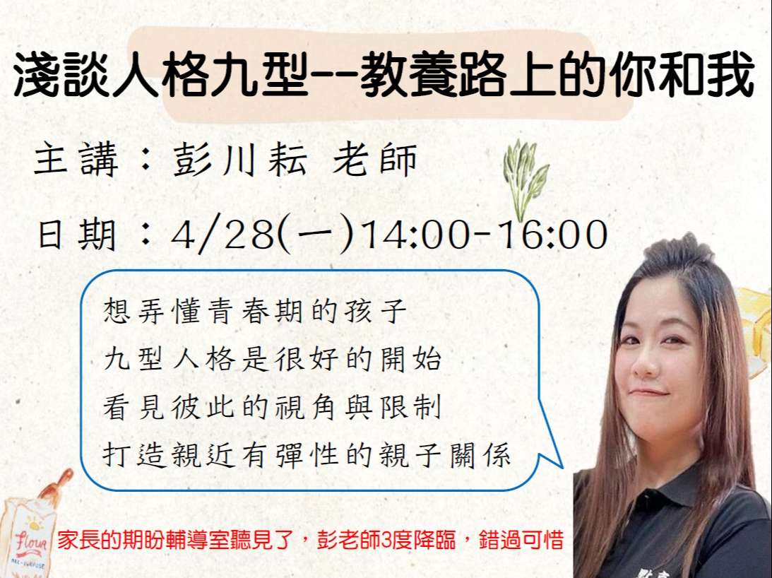 (一) 04/28(一)14:00-16:00《淺談九型人格-教養路上的你和我》彭川耘老師。